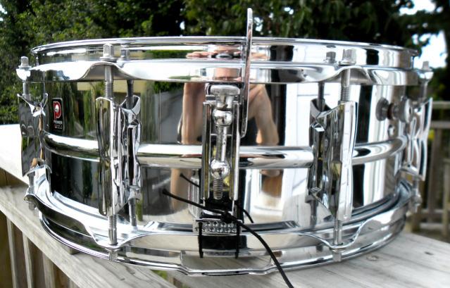 What's interesting is it's an 8 lug version of the Beverley Cosmic 21/Premier35. These were a very good copy of the Ludwig 400 so I guess that makes this a very good copy of the Acrolite but chrome plated. It is aluminium but the chrome is near flawless. It's a further example of Premier's superior chrome plating.
