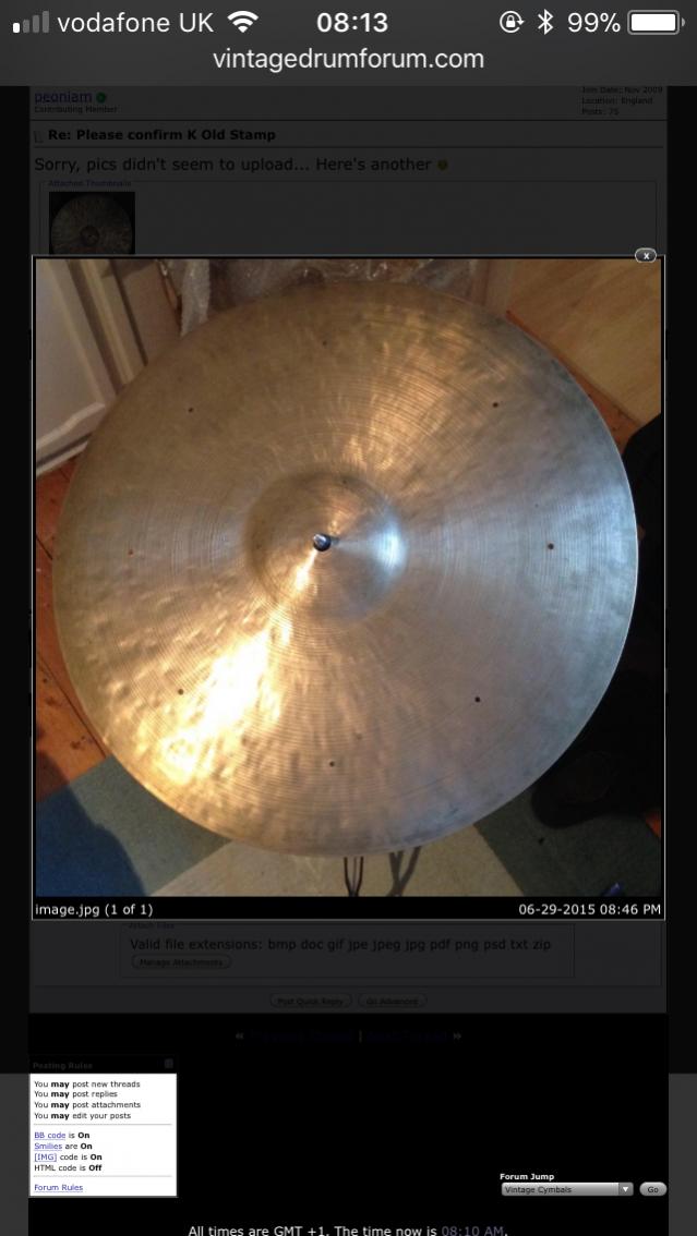 Hey all... I have an 18” K type IIb old stamp 1342g drilled for 8 rivets, centre hole fits modern stands, in realy good condition / no issues, that I’m considering putting up for sale. I’d really like to hear what kind of value you think it may be worth. I can post pics, if you like. It’d have to be worth my while to sell, as it is a real beauty and there’s no burning need for the cash, except that I wouldn’t mind getting a new snare...! If I do put it up for sale it’d be posted in this forum first, but I am based in England so shipping may be quite pricey to the U.S. etc.