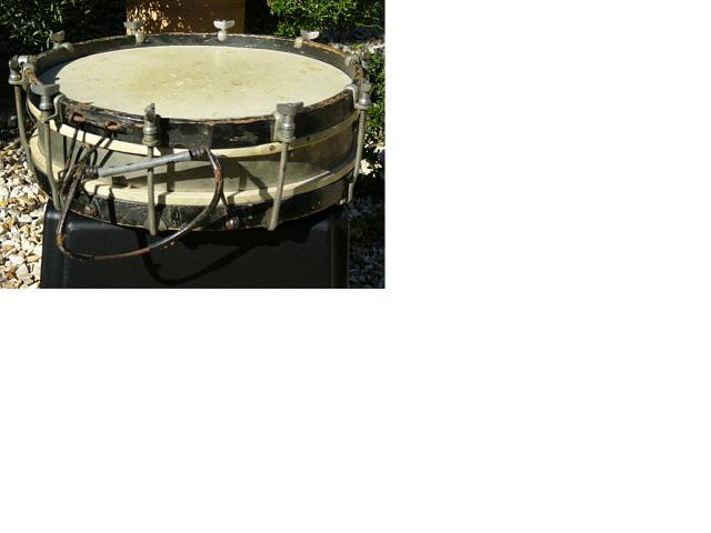 This drum was rescued from under the performance stage at a school where I use to teach. Can anyone throw some light on it? It has no name on it and was obviously originally designed as a side drum, either in a marching band or orchestra. It has calf heads and snares.