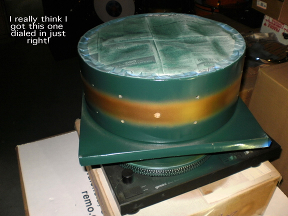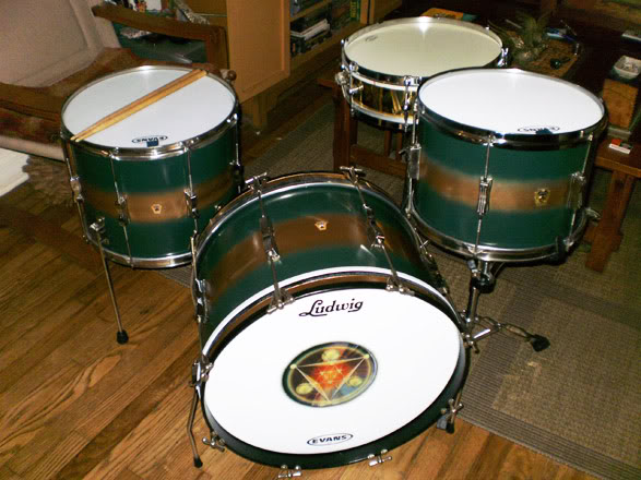 I took my cue from custom car guys, when they do a paint fade (where colors blend or meet,) they will lay down the light color first (center stripe) then come down on it from both sides (from top to middle, bottom to middle) with the dark color. The center stripe on each drum should be the same width as the lug holes. (centralized Club Date lugs)