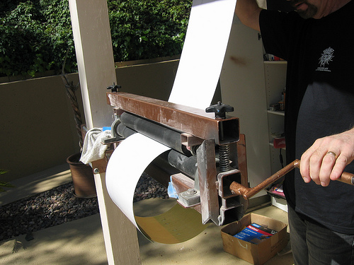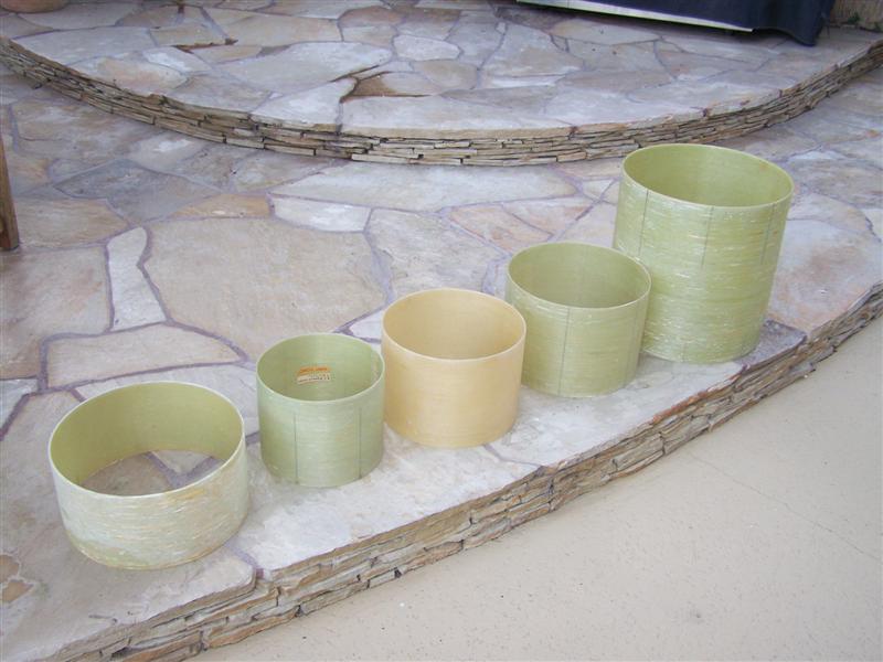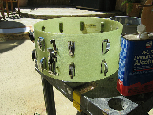 Okay guys, I've been holding out long enough over here. A friend of mine by the name of Jerry Jenkins helped me build a one of a kind drum set using Blaemire fiberglass shells. He specializes in restoring these shells which were made famous by Hal Baine and his "Monster kit". Jerry acquired a huge lot of shells and I was able to purchase 7x10, 8x12, 9x13 toms, 16x16 floor tom, and 6.5x14 snare drum shells, all virgin. There was no bass drum shell available, so I picked up a 14x24 6ply Ludwig bass drum, and stripped it, then re-wrapped to match the kit. All the Blaemire shells had a red wrap on them that we stripped off. These shells were initially made for a guy named Andy Florio, but he never ended up bulding the kit, and passed away quite awhile ago. His name is actually tagged in several of the shells. After the stripping of red wrap, Jerry and I had quite a bit of sanding to do, to get the glue off, and smooth them out. I was going to try and finish them in their raw green finish, but the shells were not consistent in color, so a wrap was in order. The snare would remain in it's raw finish though. Jerry did all the drilling and wrapping, and I had most of the Ludwig hardware that would be used, I did have to purchase the hardware for the 10" tom and the snare. Here are a few pics along the way, and the final pic is at a gig I did this past weekend. Obviously, I owe Jerry many thanks for helping me put this one of a kind kit together. More pics next page.