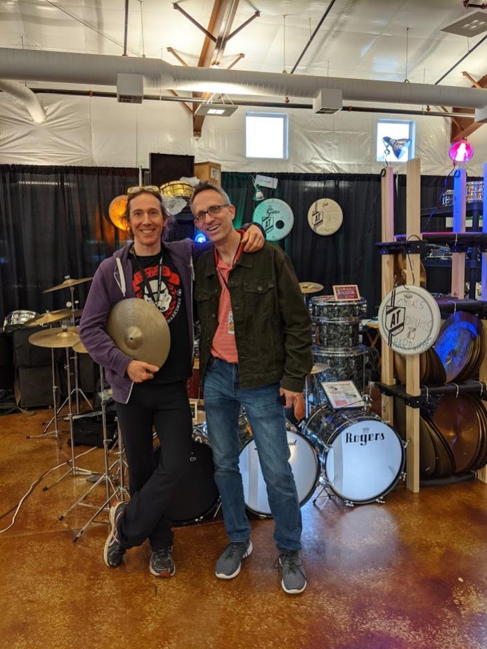 I had a pretty good day on Saturday and had one big sale on Sunday, but Sunday was much quieter overall. I also had the pleasure to talk to Kofi Baker. At the tail end of Saturday, I saw someone looking through my cymbal rack. I said if he wanted to hear any of them on a stand, I would be happy to provide him with one. He asked if I had any hi-hats. The only ones I had were out on display on a stand, a pair of hollow ink 14" New Beats. I walked him over to that side of my booth. He told me he was a Zildjian endorser, so he had to play Zildjians. It was then I noticed the slight British accent. I then knew who he was and we had a great conversation. A very normal, humble guy. He bought my set of New Beats. His wife/girlfriend had to go the car to get cash, and while she was gone, we just shot the breeze. He was real down to earth and treated me like I was an old friend. I purposely didn't mention anything about his Dad. I figure he's been living in his Dad's shadow his entire life, and I wanted to let him talk about himself and what he's been doing. We had a great chat, and he's a super nice guy. Here is a picture his wife/girlfriend took for me.