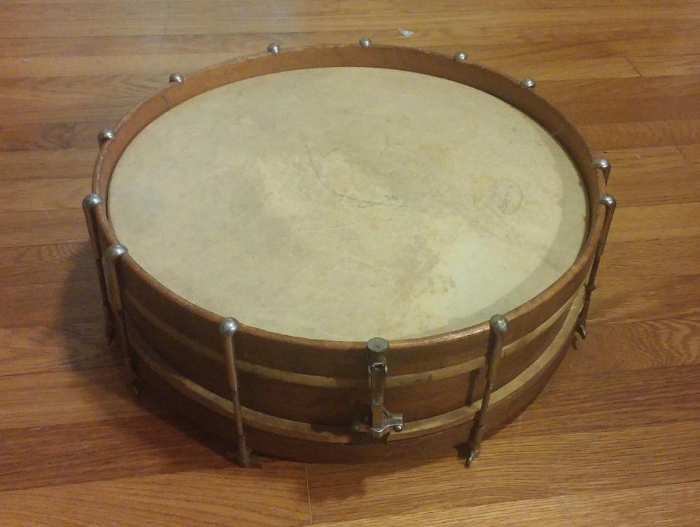 Seller states it`s a 5"x15.5"...It has 12 tension rods...Maple shell...No badge...