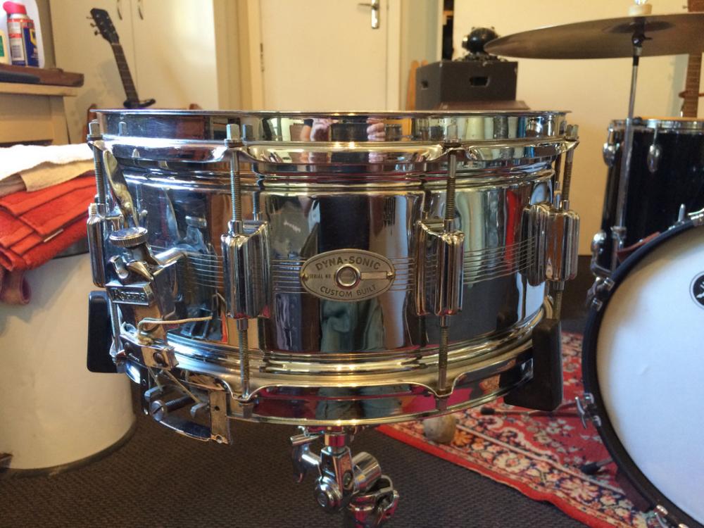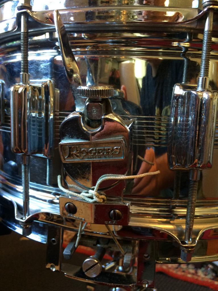 The drum is in decent shape with a few shallow dents behind some lugs and the strainer, the sort you expect on a 60s Dyna that's been well used. My problem came when I went to check the serial number. It's been removed! Hmmm.