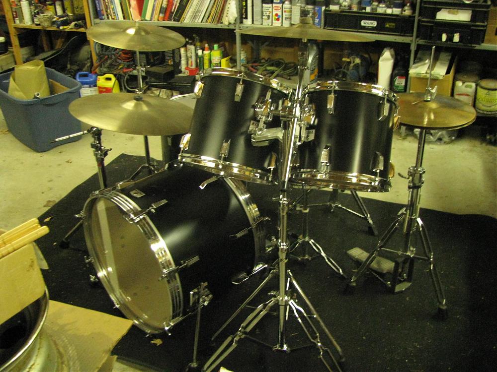 How do you keep yourself occupied during the cold winter months?Here are the results of my $75 purchase before Thanksgiving.It is an early Tama Rockstar(seperate lugs)refinished in a pseudo black panther color scheme-the original finish was gouged beyond refinishing.Included in the photos is the final piece of the set,finished last Friday,and the reason for the purchase of the whole set.An Oaklawn 5x14 Camco snare.Very different sound from snares I own now,can really be described as 60's sounding.