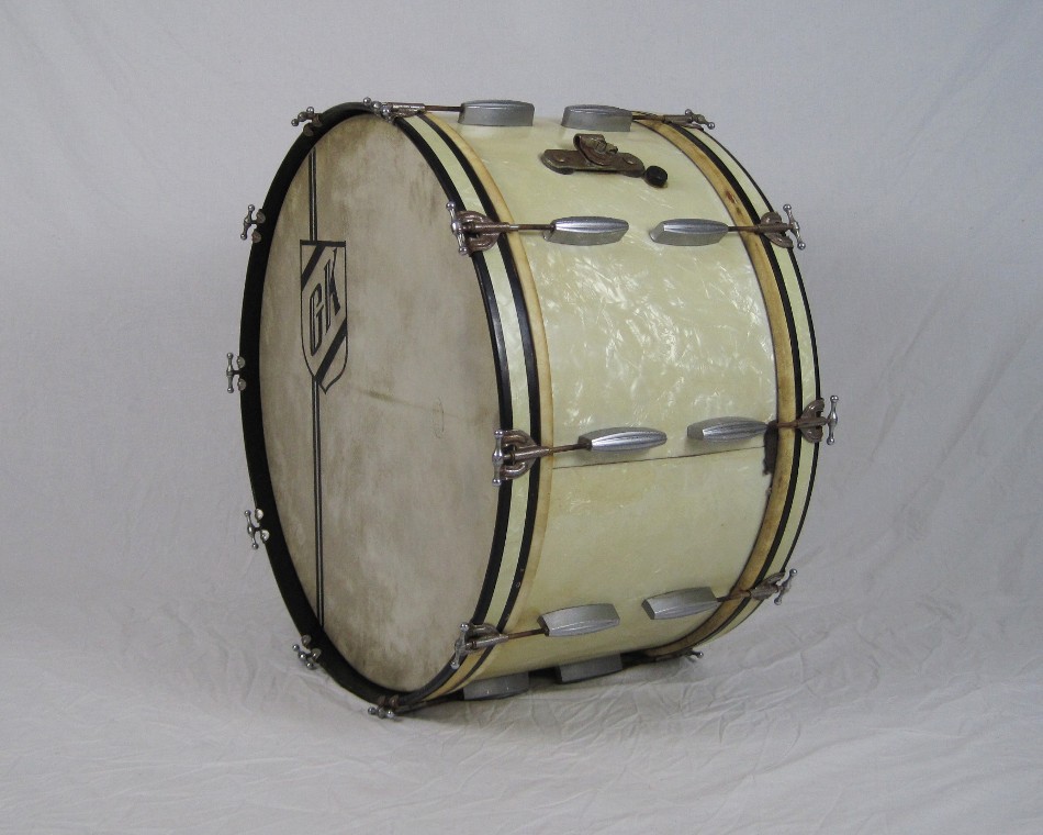 When I got the drum, I went over every inch of it with who I consider to be the world's foremost expert of Gene Krupa equipment and history, Brooks Tegler. We studied the wear pattern on the hoops, the "fingerprint" like patterns of the front calf head and white marine pearl wrap, and Brooks came to the conclusion that Gene used this drum publicly with his big band from 1946-1951. The drum shows up in countless photographs and films, including the cover of the Bruce Klauber Krupa book. The main giveaway is the three dark spots on the right side of the front calf head. Both calf heads are original, as is the felt strip.