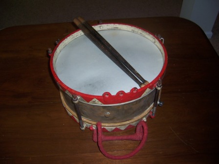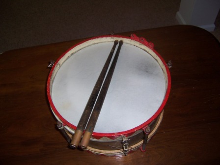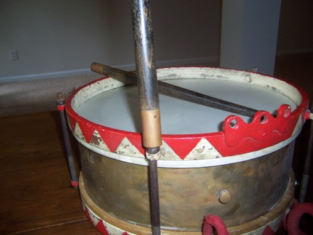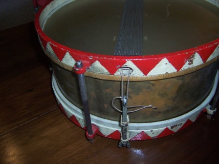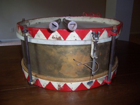 I've had this snare drum since the mid-60s and never really knew what it really was. Originally told it was Hessian vintage from Revolutionary War years, but never believed it. While in college during the 80s, I saw a picture of a German band from either the German Empire years (late 1800s) or the Weimar Republic years (early 1900s) and this style drum was being played. Drum shell is brass and the rims are cast metal of some kind, but tough to tell due to the paint. 14" x 6" shell. The hoops are original, but the calf skin heads were mounted by The Drum Shop in Detroit back in the 60s when I first got the drum. They also rigged contempory snares without damaging the original strainer configuration. The drum had old and dry rotted cat gut snares when I found it. The sticks are original and have a unique brass drumkey on the butt ends. The lug strews, total of five with a triangular head, thread directly into fittings on the bottom rim. One of the pictures shows a stick vertical with the key on the lug screw.