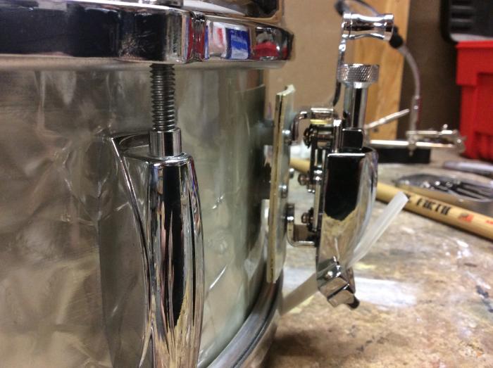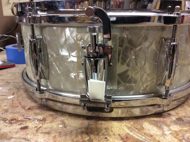 So here is my solution: cut a small piece of metal, rounded it to match the curve of the shell, covered it in some WMP, some small nylon spacers from the hardware store, and a modern Gretsch strainer.