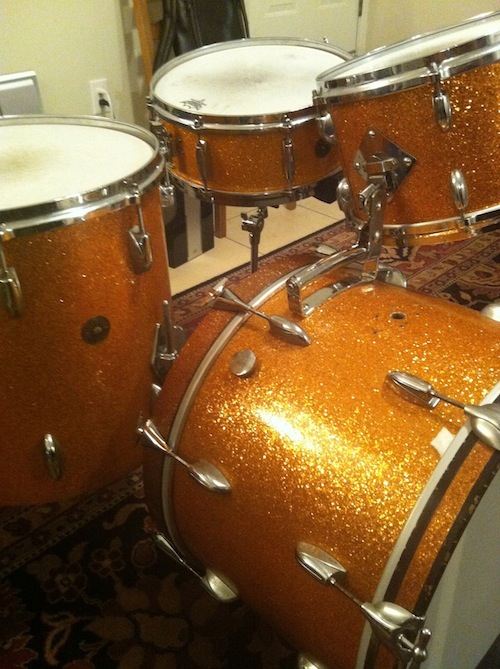 I'm going to sell my mid-late 60's 20,12,16 w/ matching snare kit. The wrap is original gold sparkle and looks great. The snare is a rewrap and matches very well. The BD and two toms have serial #'s that are very close (within 1,000 of each other) the snare serial # is 30,000 earlier. Silver interiors, paper ags are all there. BD has one non original rim and no badge. (See pics)