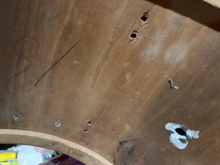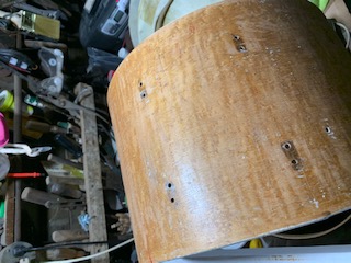 Can anyone help me with any information about what this drum is? It is a 15 1/2” head and almost 10” deep. It appears to be a one ply shell with vertical grain and an outer veneer of curly maple(?). Outer ply could be something else. There are snare beds and holes for a strainer and butt. The drum was painted at onenn by point and stripped. But the original finish seems to be a laquer or varnish over the maple outer. The “lug” holes are confusing because there are two holes per side but they are not evenly drilled so possibly added on later. Sone outline of these lugs appears to be a rectangular two hole where others look like two individual rounds. Maybe for washers. Any help would be appreciated.