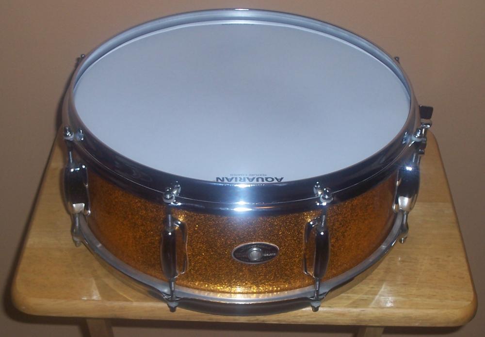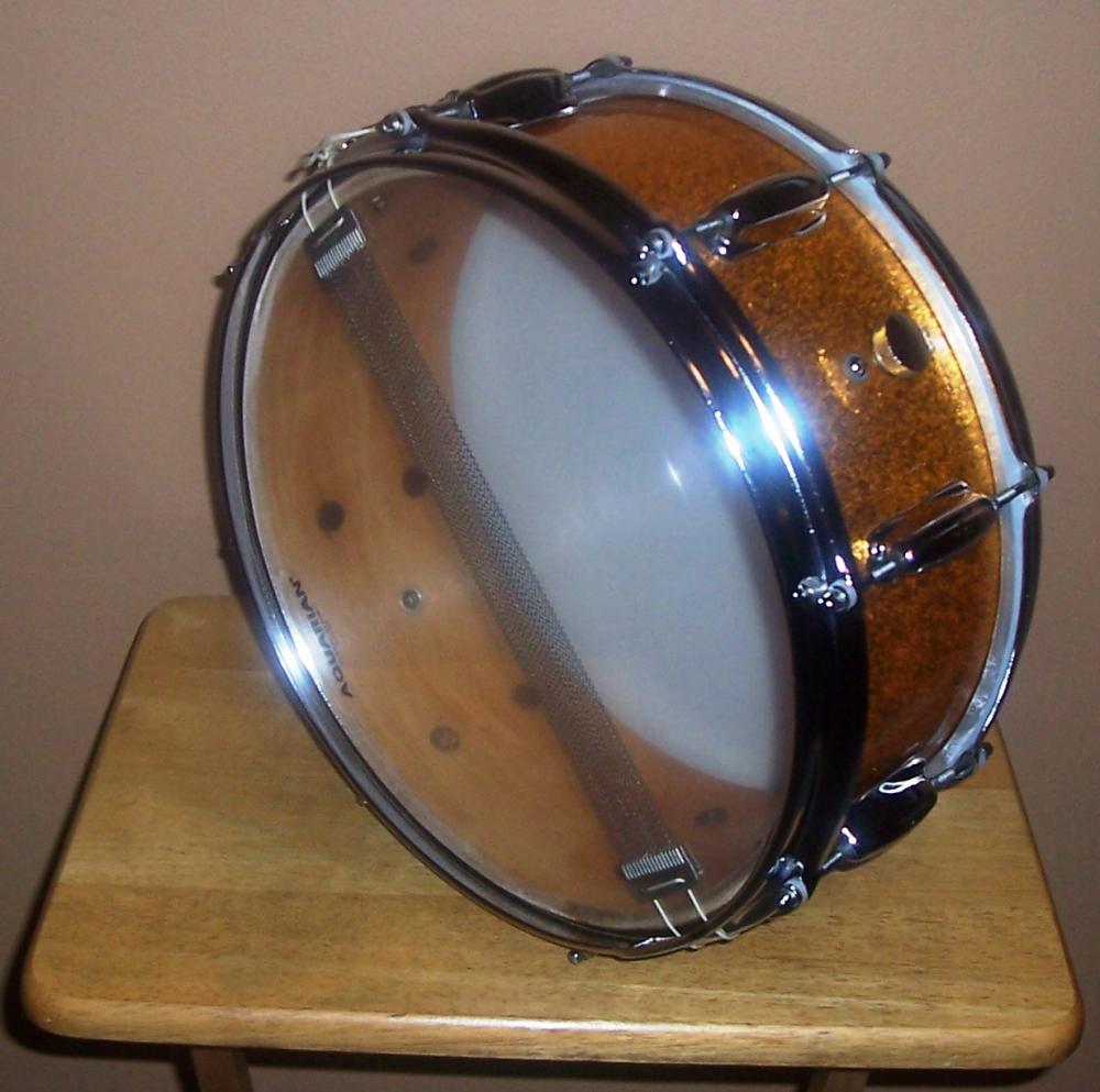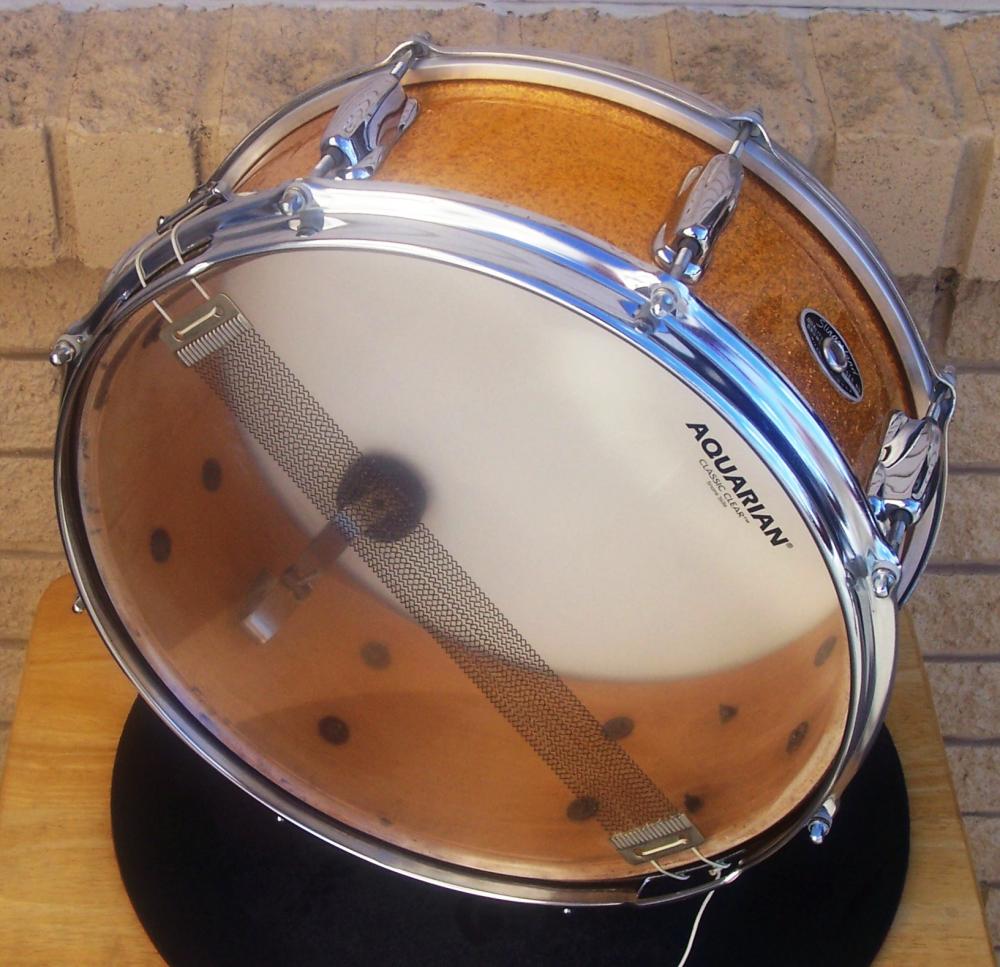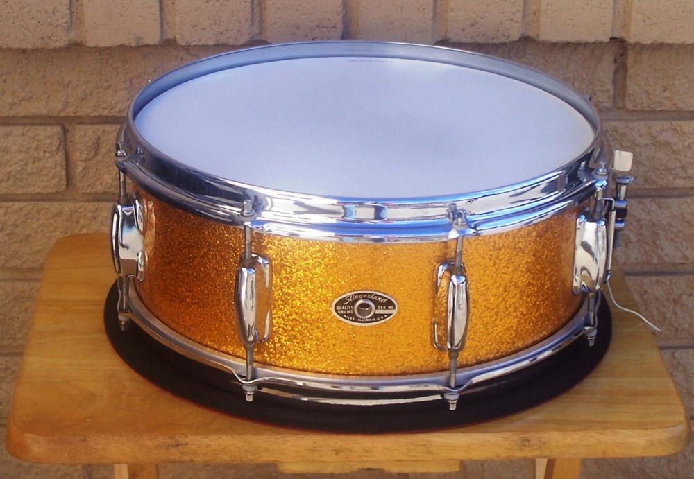 I've got a 5 1/2 x 14 Slingerland snare in original sparkling gold wrap, with 8 Sound King lugs, COS stick-saver rims, fifth generation rapid strainer, tone control with the post assembly and black & silver Niles badge, SN 254373. Based on the limited research I've done, I've concluded it's a Hollywood Ace from approximately the '75 - '77 time period. Please let me know if I'm mistaken in that regard.