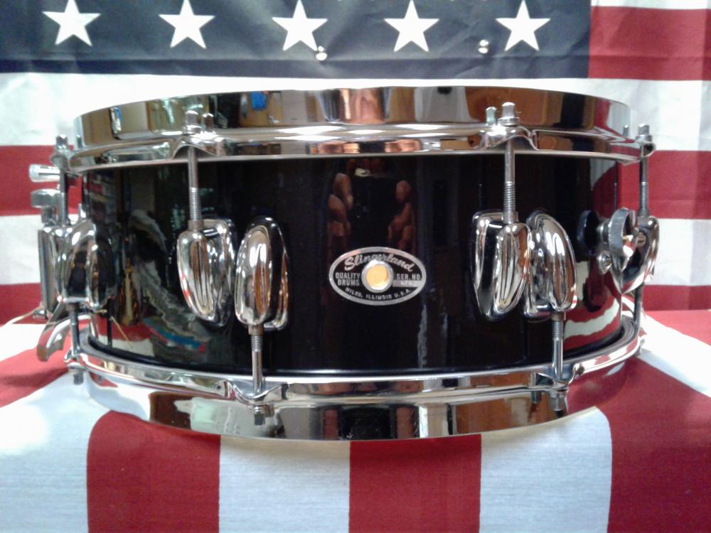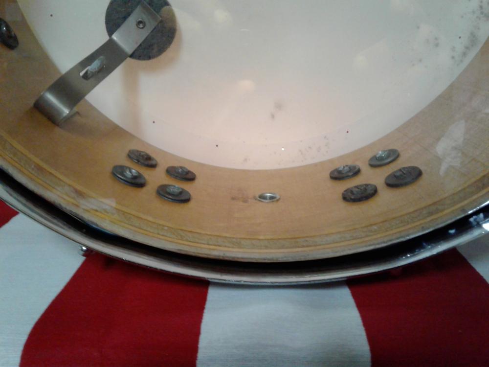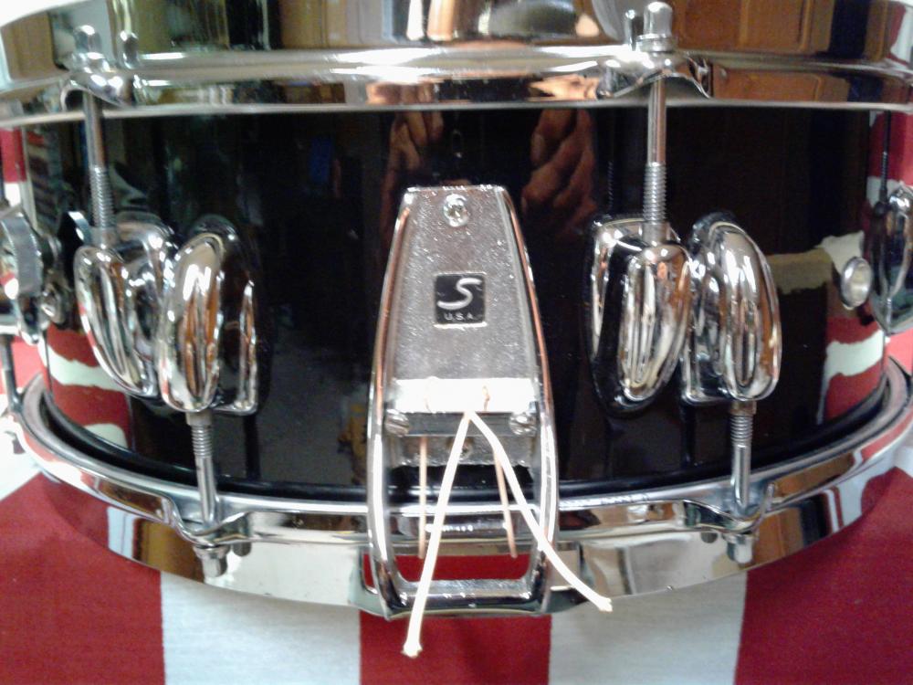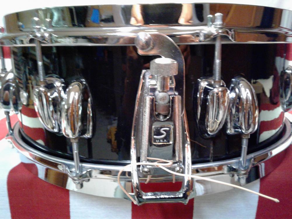 I always wanted an early 1970s Buddy Rich model but this one is a little different. The BR was 4" deep,this one is 5" deep.The BR had a Zoomatic throwoff,this one has a TDR. But mine has the single-flanged Stickchopper hoops & 3 air grommets. The hinky part of all this is the 5-ply shell doesn't match the timeline of this particular badge that is attached.The grommet looks original inside/out (I been collecting Slingerland's long enough to know). I've come to the conclusion that this drum is a custom made order from Slingerland or someone did one h*** of a custom job themselves. It would be a challenge for even the master craftsman to line-up the offset lug's to perfection.What do y'all think?[Attachment: 113479]