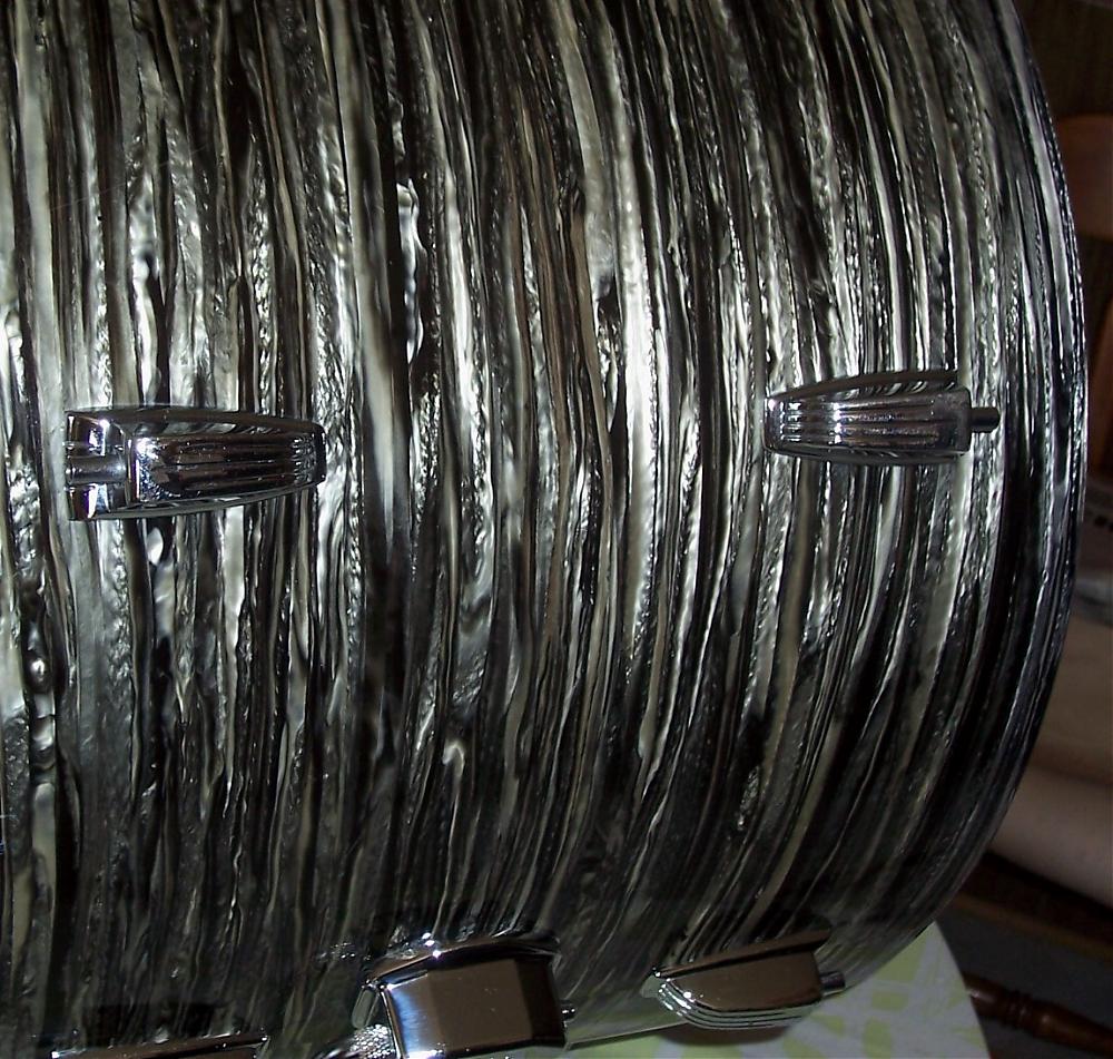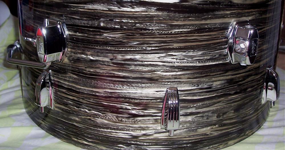 Today I spent some time polishing the original wrap on my 1964 Oyster Black Pearl Kit. The exterior view of the drums (original OBP wrap) is in total contrast to the interior view (original white resocoat finish wish significant scratches, scrapes and flaked-off paint).