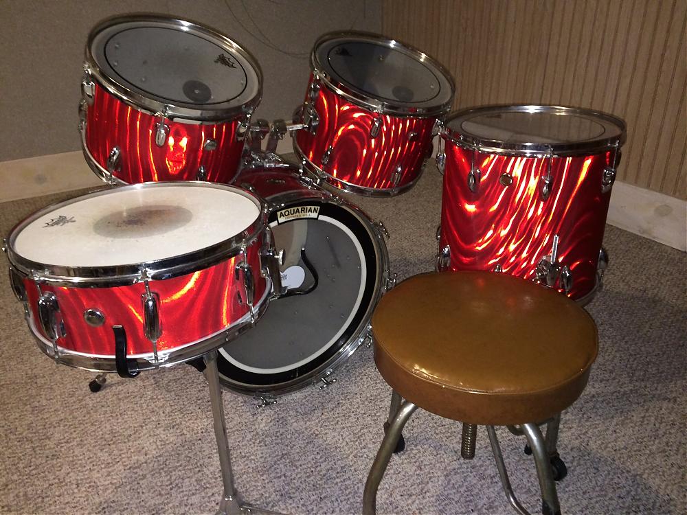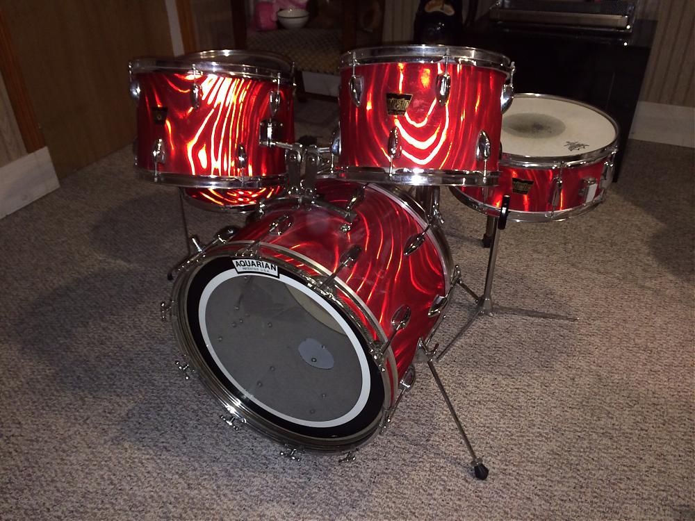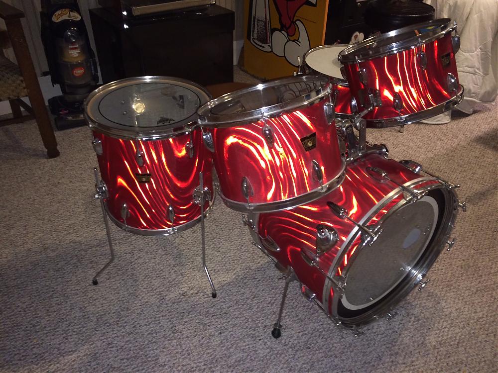 I bought this set tonight. It is SO looking! It's small, the same size as my old Ludwig set (20" bass drum, 14" floor tom, 13" and 12" toms and a 14" snare drum). The way the toms are mounted on the bass drum is weird. They are like clips that the drums slide into. My extra Vistalite toms are kind of like this but they are on a stand. It's in great shape. The throne that is with it weighs a ton! There is a metal thing on the bass drum that I don't know what it does. I think it hold an extra drum or a different way to mount one of the drums or something.