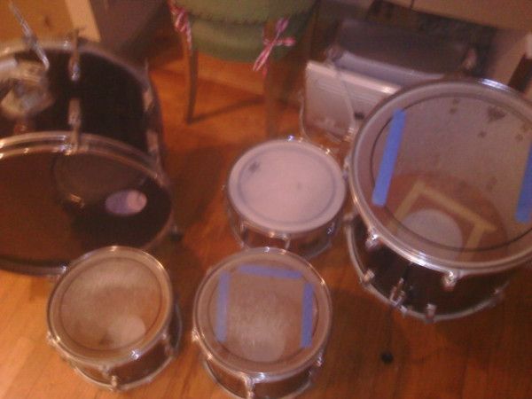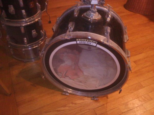 1984-ish swingstar in standard sizes, that's the "zola-cote" sprayed on the inside to protect the luan or "mohogany" from moisture. the wrap on these drums is well glued and hard to remove. my drums are X-tras sizes (11x12 12x13) and are low pitched and dont have a lot of sustain (mounts and the ruff interiors) but they do take a beating, and yes the kick will slide away easy.
