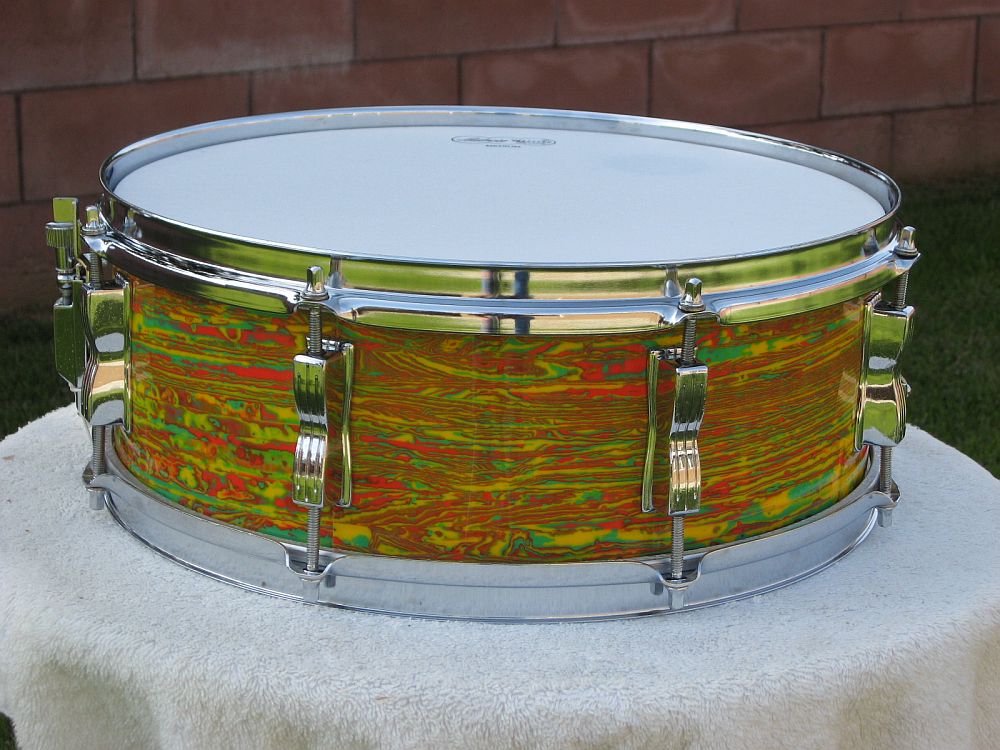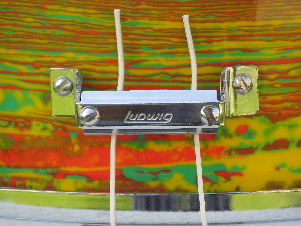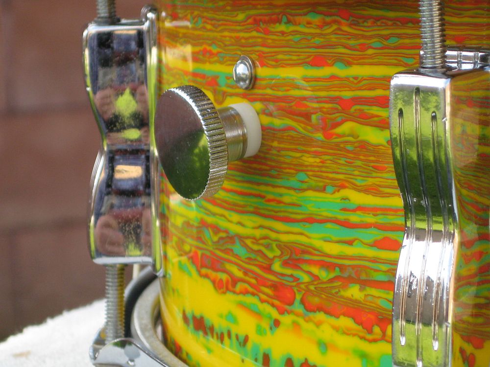 The drum was wrapped in Citrus Mod from Jammin Sam. No additional holes are in the shell. The strainer is an early P-85, with short throw arm and 1/2" mounting distance above the shell. The P-32 butt is also the 1/2" height variety.