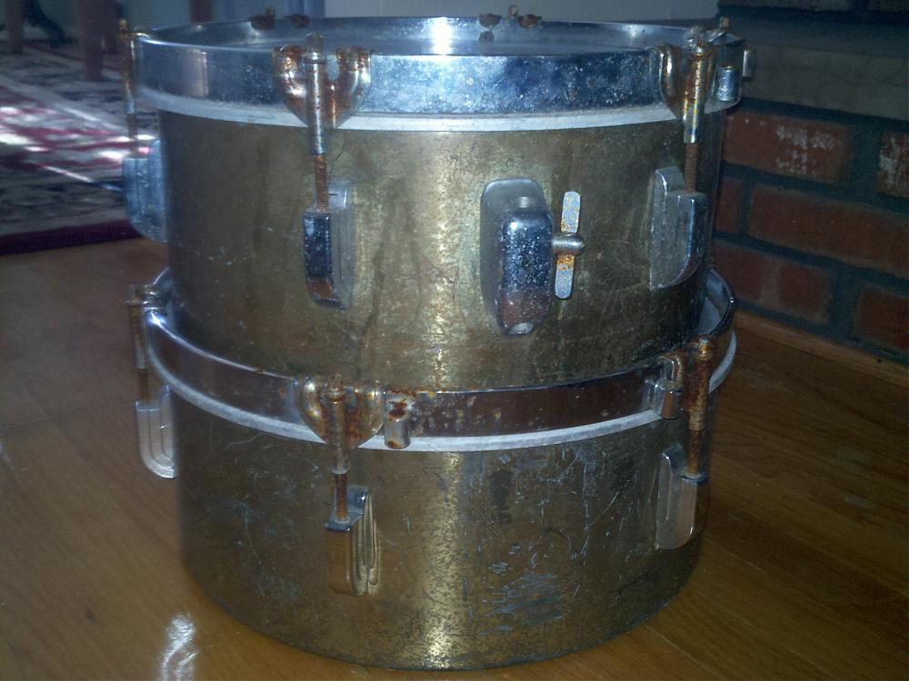 I initially was selling these for a friend but just could not seem to part with them because they sound amazing. So long story short I bought them. What I have is a set of Leddy Brass Timbales. As you can see by the pic they are in need of help. Anyone have any suggestion on restoring the the brass on these? Thanks for any help.