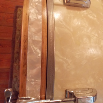 I acquired a 3-pc Leedy from 1940/41 (at least the 2 toms are stamped). The wmp wrap on the toms was is very bad shape. I ended up removing. The BD wrap on the other hand was in good shape, only very faded. I think I may broken all the rules for vintage drums when I used chemicals to clean (or should I say, remove the upper layer). However, it looks pretty good. My question; I have ordered some antique wmp from Precision to re-wrap the toms. The antique wrap is still a bit lighter that the BD. Is there a method to artificially age the new wrap? Place in direct sunlight for a period of time? Cover with light coat of varnish to impart a slight yellowing? Open to suggestions. Thanks