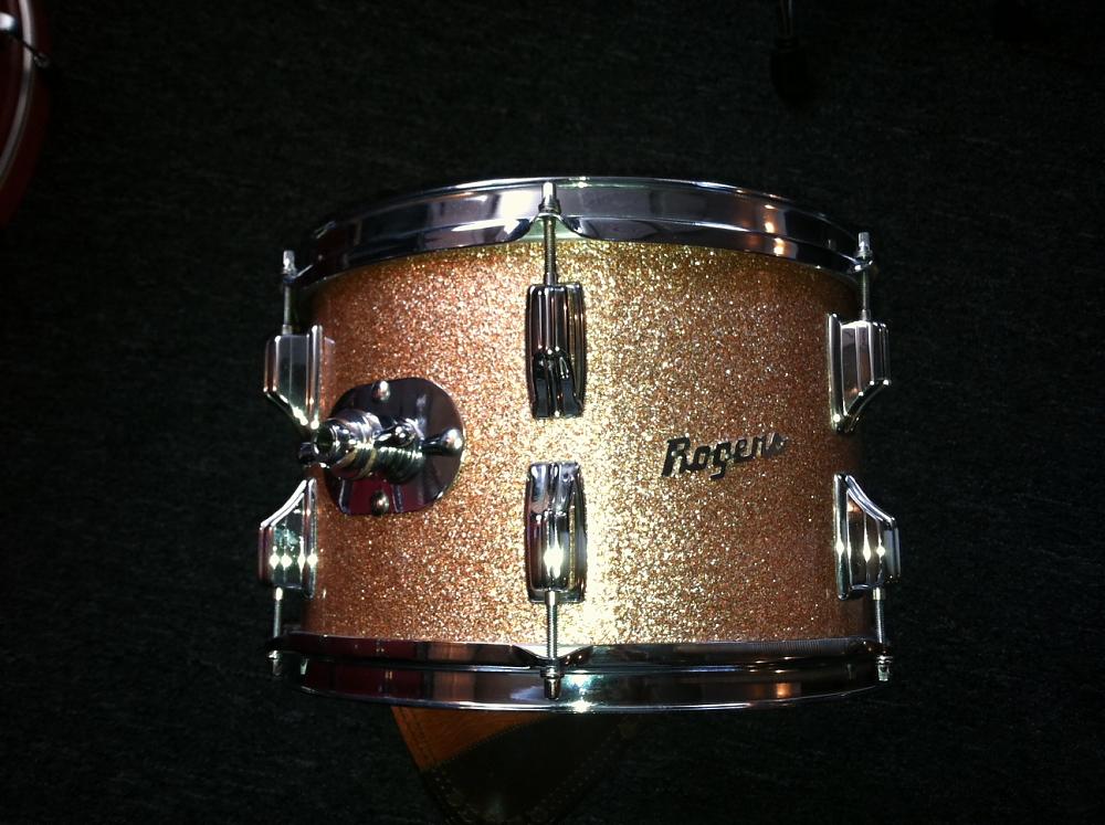 I have a 4-pc champagne sparkle Rogers kit in excellent condition. Interior is a gray spatter finish and they have stickers inside that say "Rogers..Powertone...Fullertune Calf...and are numbered and hand initialed...No. 25669 - they are suspected to be about 70' - can anyone help identify