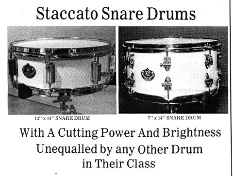 Between 1982 and 1984 Staccato kits were manufactured by Ayotte in Canada. During that time Ayotte also produced 2 types of Staccato snares (see picture):