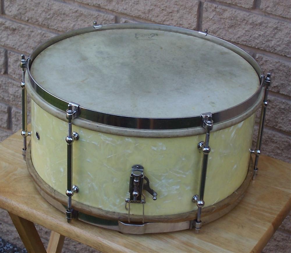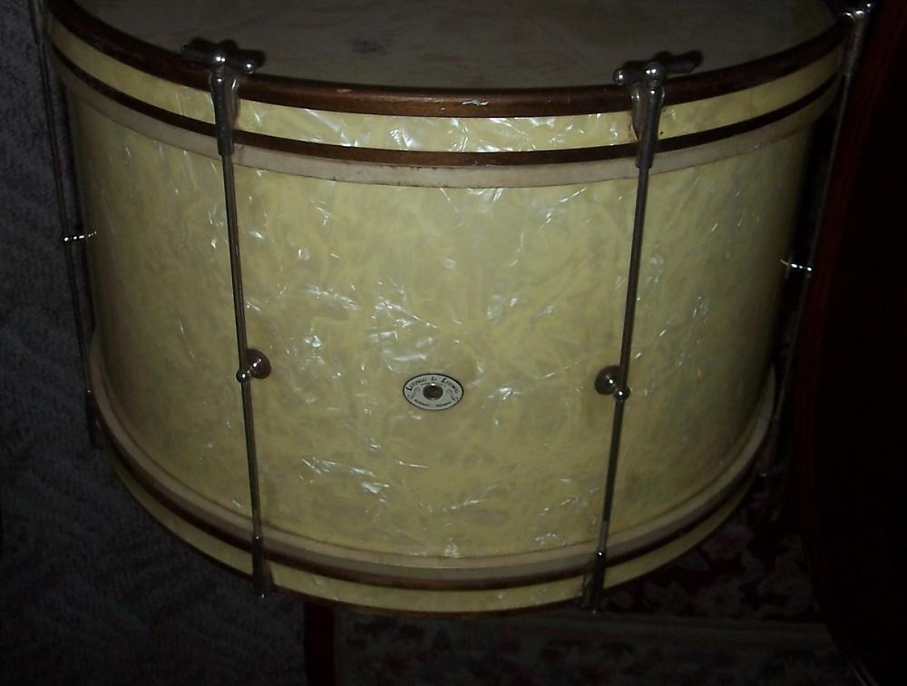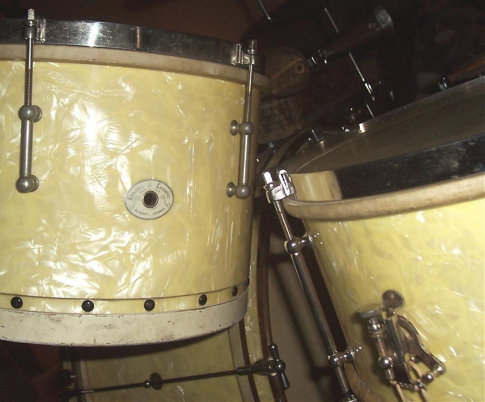All pieces, including the Leedy floor tom, seemed to have aged ("mellowed", never "yellowed") quite evenly so I would think that the Leedy floor tom was used as an integral part of the kit at a very early stage.