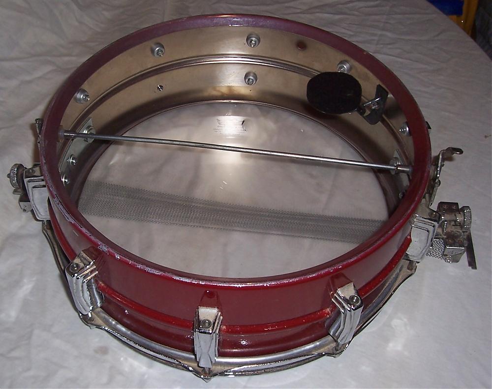 I'm trying to properly identify and date the snare drum. The serial number on the badge appears to be 1596291 from what I can tell under the reddish paint. I believe that would date the drum to around 1978. Please correct me if I'm wrong. I initially believed that the drum was a Super Sensitive model but, being unfamiliar with them, I'm not sure whether the strainer is correct. I'm hoping that the pics I've posted will help someone out there properly identify and date this one. The snare wires don't seem to fit on this drum either. I'm assuming one of the prior owners purchased the wrong size wires. These seem too long. The actual snare wire "piece" is about 18" long, while the wires themselves are about 16" in length. I'll provide a separate posting to show how they extend too far on this 14" snare drum. I apologize for the cosmetic condition of the drum in the pics. I haven't had the time as of yet to give it it's much needed "bath."