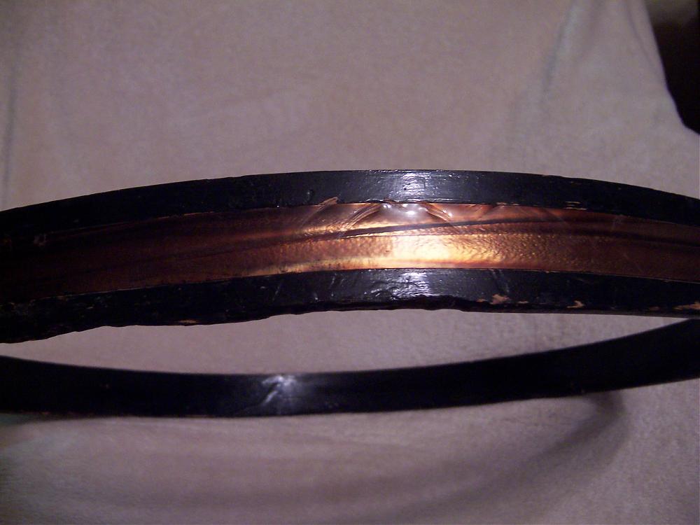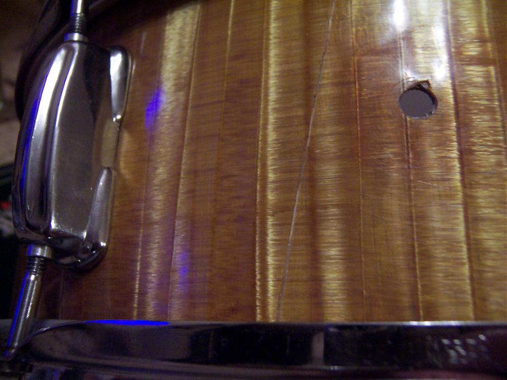[COLOR=black]Edges are double 45^ and have been smoothed with 220, contour is original, only kissed the edges to enhance tuning. It worked. No longer is this snare flat and uninspiring. Cleaned the interior up with a quick sanding, nothing major, just closing the grain. This technique is what makes my snares sound like they are supposed to, snare drums, not a tom that has had wires taped to it. There is a small spot of rash under the butt plate from a small cymbal arm that held a splash, presumably. Other than that, the wrap is clean, smooth a bright, no noticable fade. This is 8.5/10, new batter, cleaned and lubed. Snare side is original, has a few small holes that have been taped. Since it tunes up and plays very nicely, I see no reason to replace it at this time. [/COLOR]