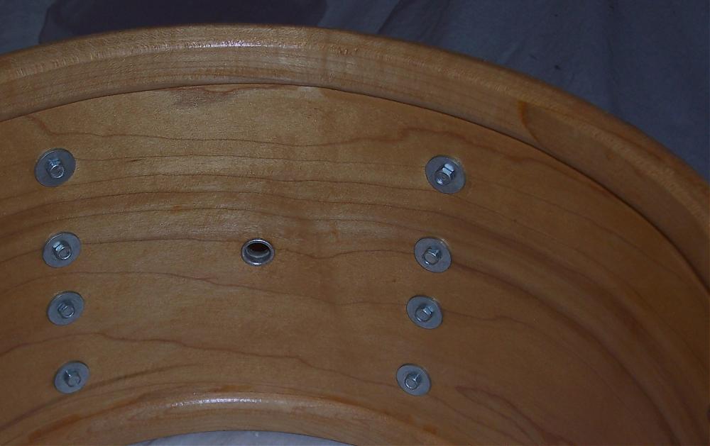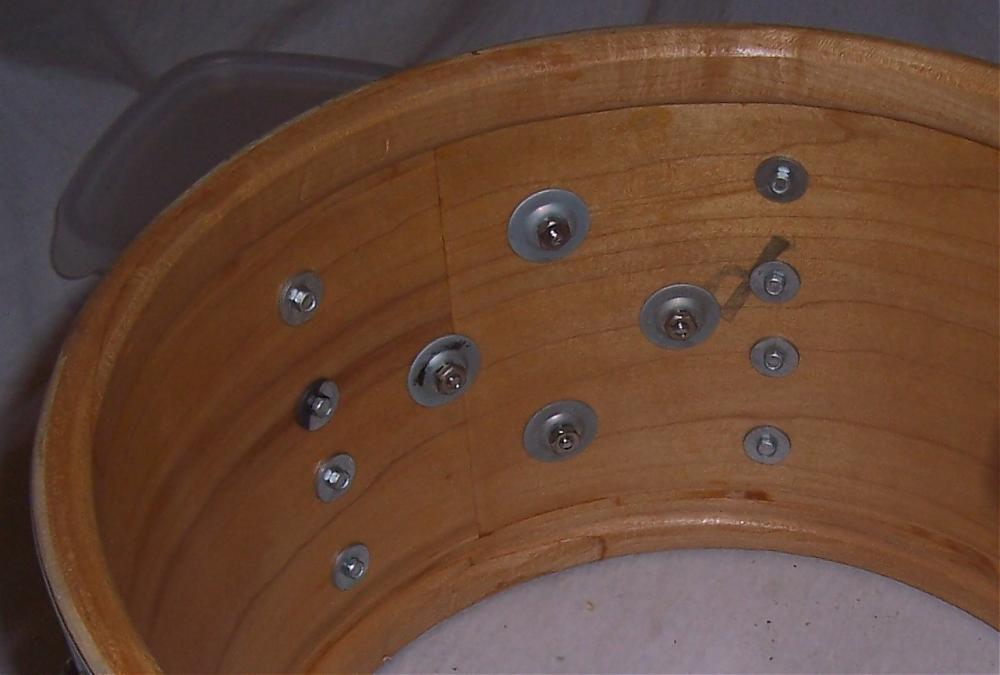 If it was a late '60s drum, the interior would be finished with a "chocolate milk" colored stain.The 1971 catalog seems to indicate a pretty complete transition to Set-O-Matic hardware. Only one kit (the Windsor) is pictured with a rail, but the accompanying text clearly states a Set-O-Matic tom holder.The Set-O-Matic mount is a diamond shape, much like the old consolette mount plates. Anyone know if the screw holes line up? Maybe someone swapped it?...and Slingerland being Slingerland, with a well-known reputation for exceptions to the "rules", I don't think it's impossible that an early '70s drum might've shipped with a rail.