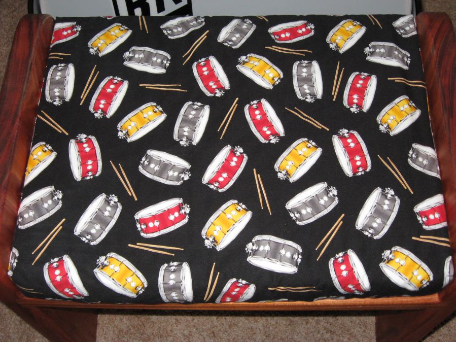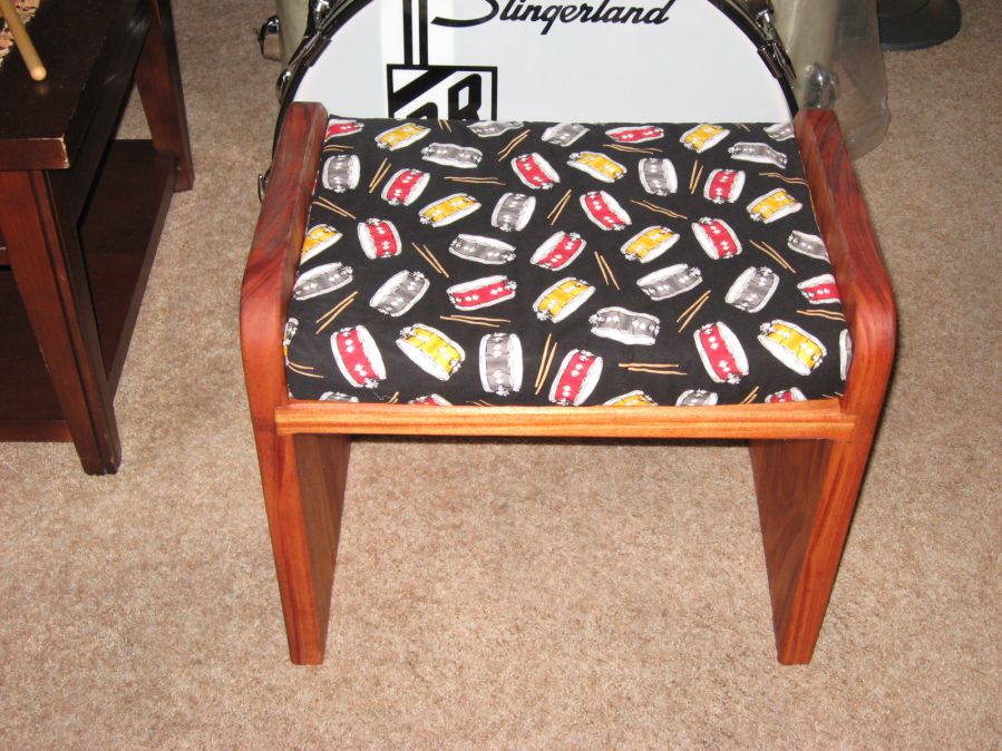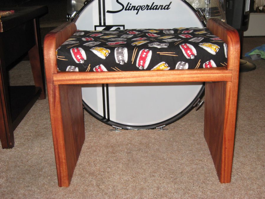 So...my girlfriend and I recently celebrated our 15-year anniversary. Fifteen years of non-marital bliss! As a special gift, she gave me a custom-made solid mahogany bench, complete with a one-of-a-kind cushion she made, with a cool DW snare drum cover. She found the material online. Is this too cool or what?!!