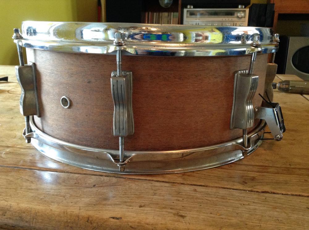 Well, it ended turning into a project. Once I finally got all the mack-tack & broken lugs off the shell I realized how nice the outer ply of mahogany looked. & thanks to the fine folks at VDF for helping me identify this snare as a Slingerland Artist. I then started to dig for Slingerland lugs & a Zoomatic strainer on the net and quickly figured I could buy another snare for the price of parts. I'd been cleaning up an old Ludwig marcher at the time and after looking at the hole spacing on the remaining Slingerland lugs I realized that the nickel-plated Bowties from the marcher would work. Since this is a players drum anyway I went ahead and drilled for the generic strainer which I had kicking around. The last step will be to add a muffler using the original Slingerland muffler, but I'm going to swap out the knob arm for a nickel-plated Ludwig one once I find where I put it...