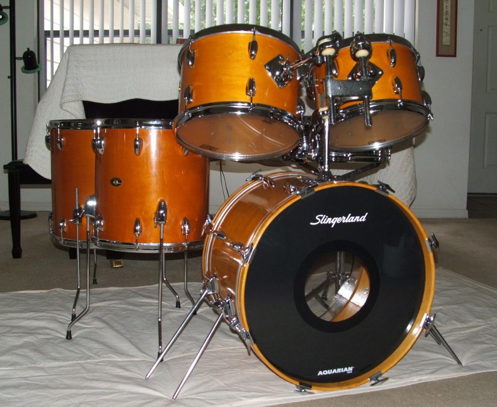 I thought you’d like to see these drums and maybe enjoy hearing the story behind them. I know I’d like to hear your feedback and comments. Start off by imagining if this kit had been listed recently on eBay; there might be a few questions and head scratching over it. What you see is a set of maple Slingerlands with Niles badges in the following sizes: 20” bass, 12x8 & 9x13” rack toms with 14x14’ and 16X16” floor toms and a Buddy Rich COB snare with the TDR strainer. The serial numbers are as follows: Bass drum: 266629, 12” tom: 403893, 13” tom: 403891, 14” tom: 403894, 16” tom: 403895, snare: 495994. There is no set like it listed in the catalogs of that era and the strange part is the shells on the bass drum and floor toms are standard 5-ply but the rack toms are 9-ply…What gives?