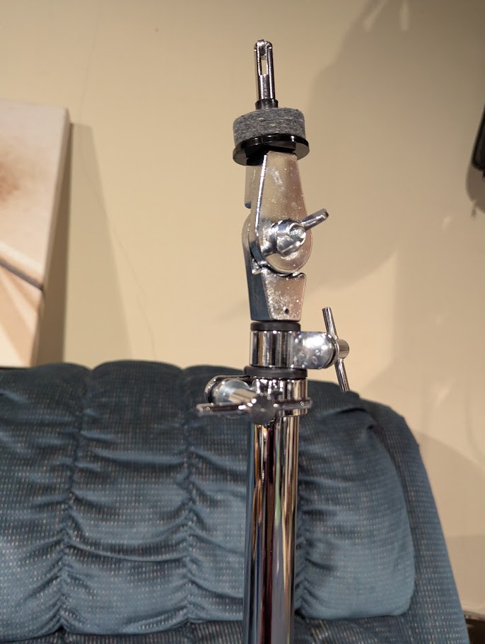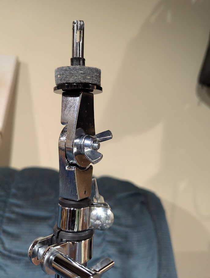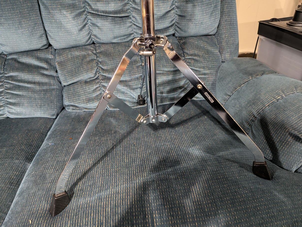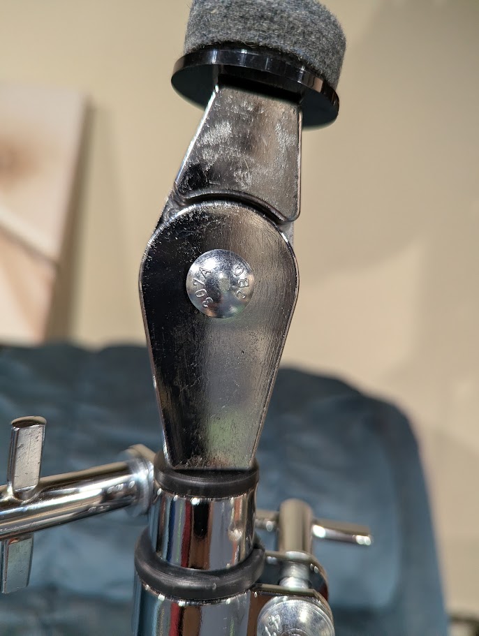Anyone have any guesses as to the make/model of this stand? I recently came across one on ebay for a great price. I found a second, matching one on Reverb, also for a great price. The only markings anywhere is a sticker on one leg that reads "Made in W. Germany". They remind me of the 70's Pearl stands that were very popular back in the day. Nice beefy tilter on this. The tilter threading (where the cymbal and felts go) is 6mm and the tilter angle adjuster is/was 6mm. All the other screws nuts were 8mm. I say "were", because the screws were rusty and slightly bent. They were carriage screws (smooth round head with a square underneath the head), and it's very hard to find metric carriage screws here in the US, so I replaced them with 5/16" carriage screws and re-threaded the T-nuts accordingly (I replaced the tilter angle adjuster with a 1/4" carriage screw and used an older Ludwig 1/4" wing nut). The T-screw that controls the tripod spread is original (8mm).