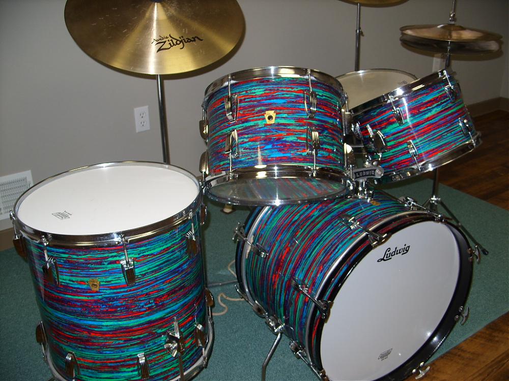 I bought my drums used from a private party while in high school in early 1970 for $350. The seller had purchased them new 2 years earlier from Faust Music in Milwaukee, Wisconsin. In fact, one of the original heads still bears the Faust Music stamp indicating "Milwaukee's Drum Center", along with their phone number and address.