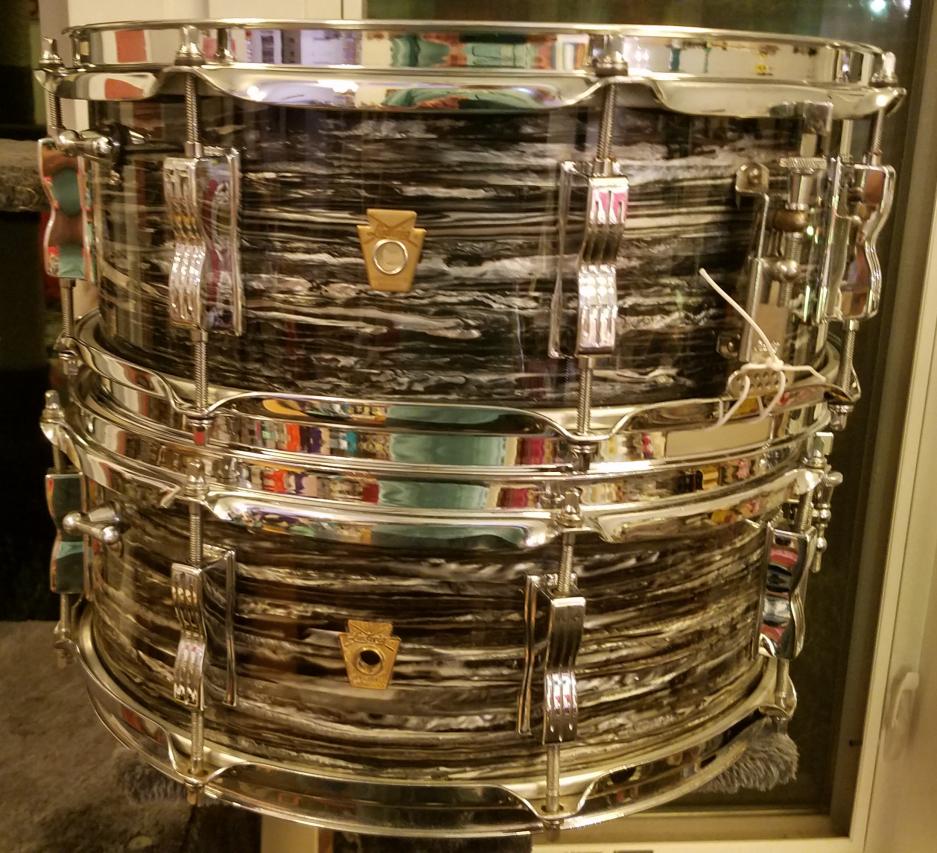 I have three snares in the modern version of the 60s OBP, One was a reissue from Ludwig a few years back and another is a drum I rewrapped myself. The most recent is one of the more recent Ludwig re-issues that has all the right details. I really lucked out on that one, getting one with a very accurate piece of wrap on it (some of them were not a great match to the original stuff...it's the luck of the draw). The last time I took out one of my OBP sets I used the new drum and left the more valuable original safely at home.