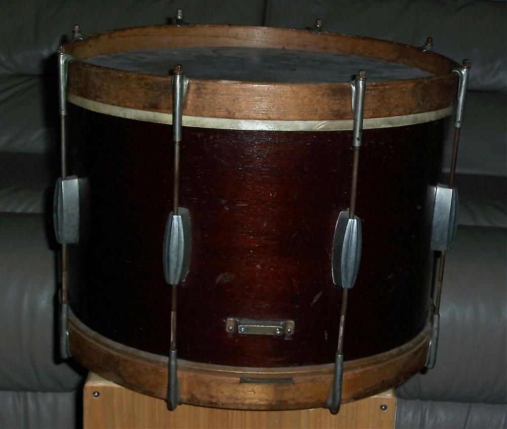 I happened to spot this 12 x 15 "old dog" in a music store while dropping off a drum kit earlier today. Since they were just about giving it away I grabbed it if for nothing more than a nice little display piece in my music room. The pics that I posted show the drum in its "as is" condition as purchased. It's still got all its original hardware on it as well as its calfskin heads, with the bottom head having some sort of "crown" barely visible on it. I'm assuming that it's a Radio King logo, although I've never seen one like it before. I'm more than lilkely going to apply a little Restor-A-Finish to the shell and wooden hoops to clean them up a bit. I've also got a couple questions that I'm hoping someone out there might be able to help me with: