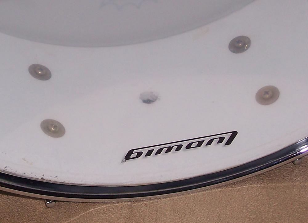 There is one hole in the shell (see pics) that looks like it was drilled for a grommet which has since been removed. I've tried to show a pic of the hole from the outside as well as the inside of the shell. You'll notice that the hole is somewhat bigger on the inside. I also noticed two extremely small holes on the interior of the shell not seen on the outside. I'm assuming that these might have been used to mount a badge. I can't say for sure. I couldn't get a good pic of these unfortunately. Both heads on the drum are in extremely good condition. I haven't even struck the drum since I purchased it. The batter side head is a white (non-coated) Remo WeatherKing Emperor. The snare side head is a Ludwig Remo UK Drum Head Made By Remo in China (which makes absolutely no sense to me).