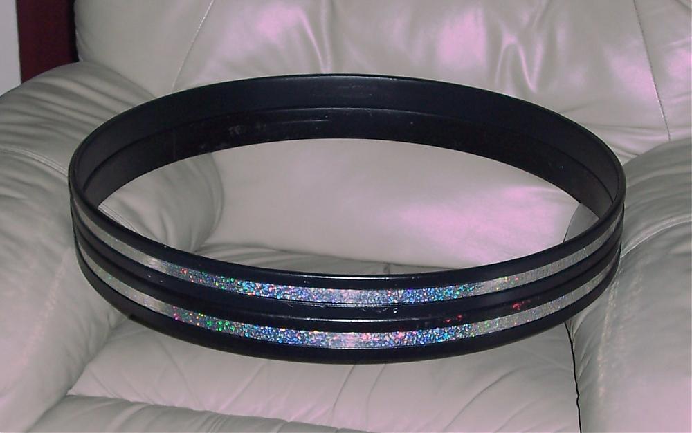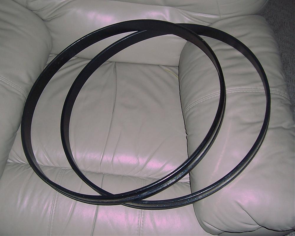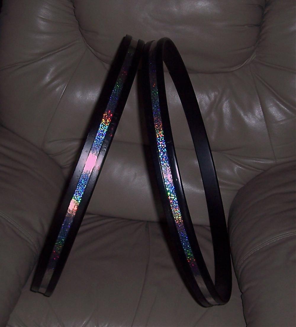 I've got a pair of 20" bass drum hoops that were mounted on an early 60s Rogers Holiday BD. From what I was told by the prior owner, one of the hoops was original to the drum while the other wasn't. One of the hoops (the original?) measures 1 1/2" wide while the other is just slightly less. Both hoops have 1/2" in-lays. The silver sparkle material you see in the in-lays is glitter tape. I'd like to get $50 for the pair + shipping. If interested please drop me a PM. Thanks!