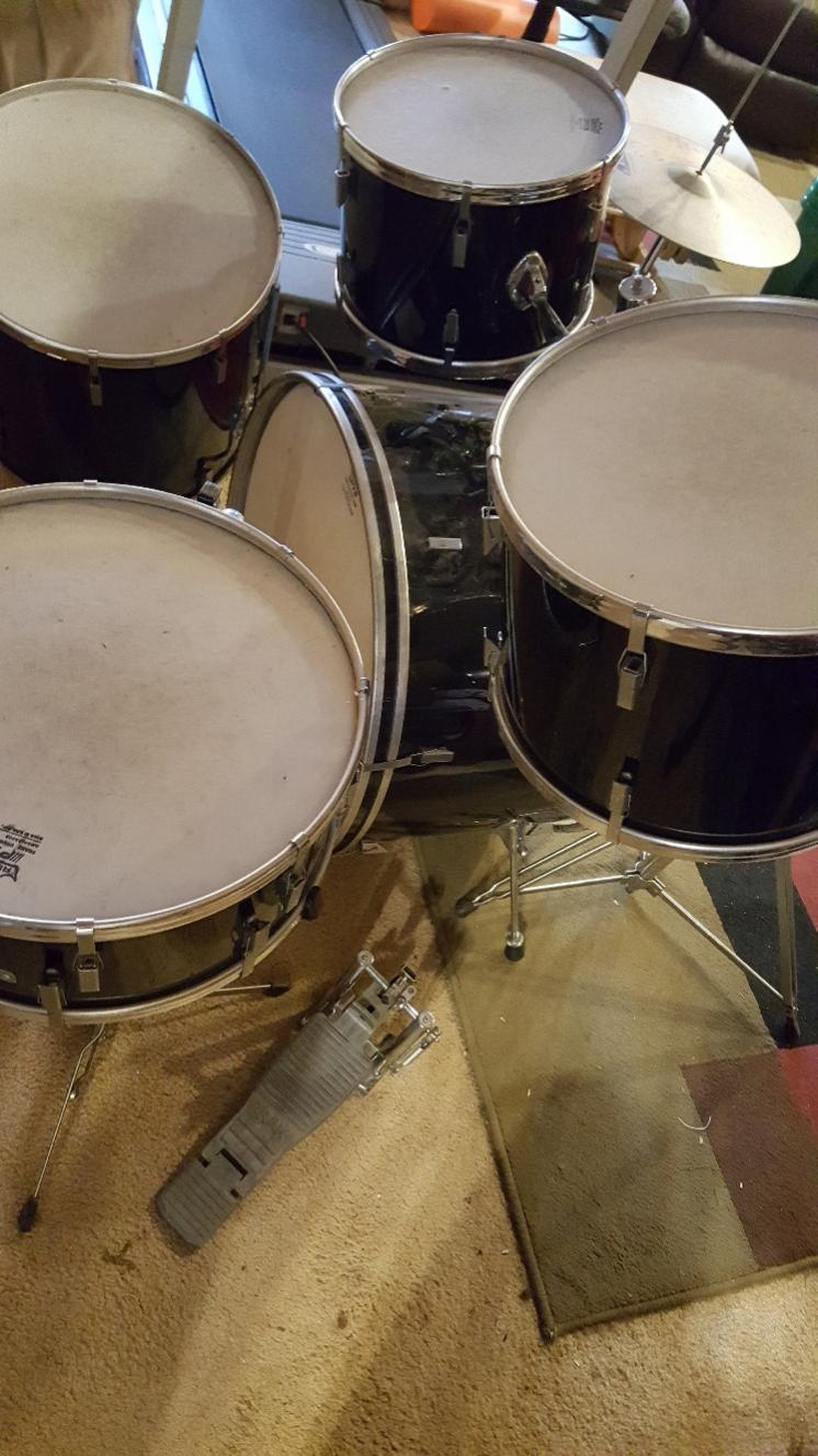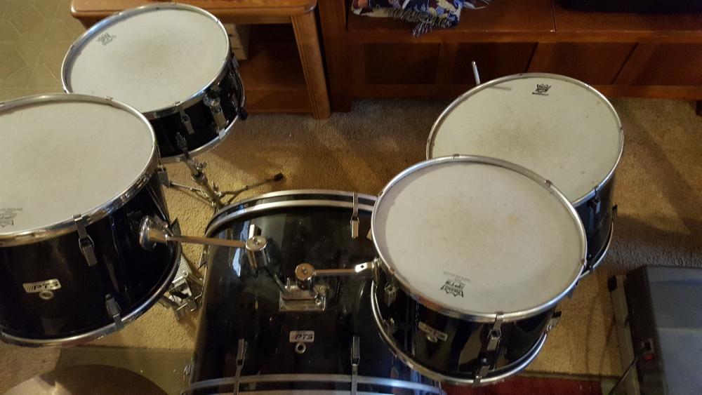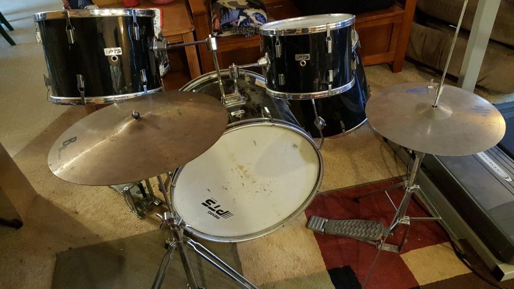Remo PTS 5 Piece Drum Set plus cymbals, 80 -90's vintage, made in USA. Avanti 14" Medium Hi Hat Hihat Top and Bottom Cymbal made in Germany. B8 by Sabian 16" Crash Cymbal.
