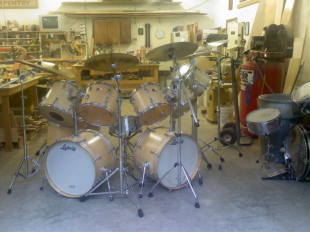 Hey thanks for showng off you kit they look very nice. The Rocker 2 is what got me started on restoring drums. I was going to re-wrap the red kit in the picture below with wood veneer but was afraid I might be doing something stupid. Thats when I found this site and asked for oppinions. The result was to go ahead, these are not vintage drums and are Ludwigs entry level and know one wants them. Well, I still felt like it would be a sin to remove such good wrap so I collected a bunch of orphans from ebay and built a monster Rocker kit and wraped with maple veneer. I love it and think it sounds terrific. Mine have the maple shells, exept fot the 16" floor tom, it has the granitone finish inside.