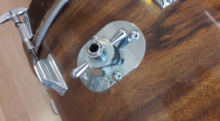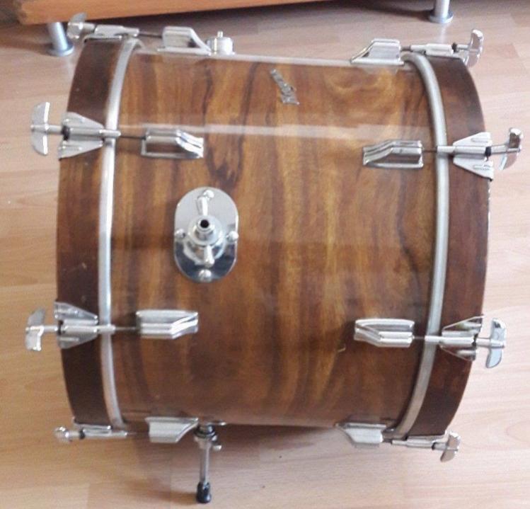 The bass drum looks good, don't have extra holes and all the hardware is there. My doubts are about the finish (is this the KOA finish?), the hoops, the era/year and it look kind of strange to me that the badge is reversed?