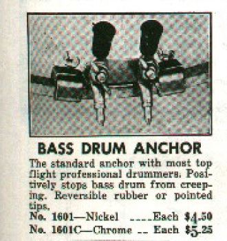 I'm trying to determine whether the Rogers Drum Company made its own bass drum anchors for its kits. The anchor in the pics that I've attached came with a Cleveland-era kit that I purchased years ago and recently sold. I might end up selling the anchor and am simply trying to find out if it was original to the kit so that I don't misrepresent anything. I noticed that the configuration of the rubber tips on the anchor appear to be identical to the rubber feet that were on the floor tom legs of my kit. For whatever reason, I can't seem to find any pics of Rogers' bass drum anchors in the catalogues that I've got. Any "words of wisdom" would be greatly appreciated.