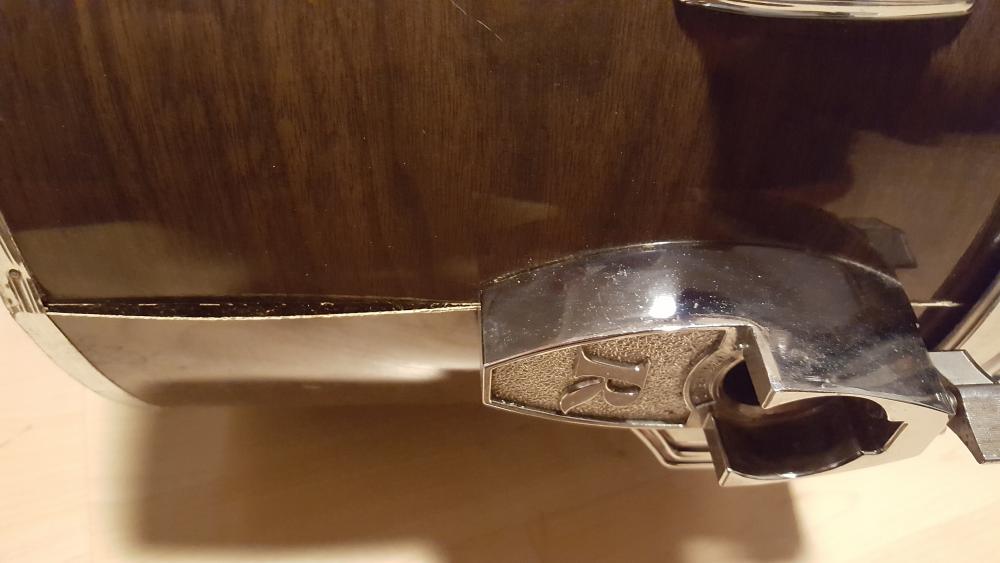 Overall the condition is pretty good but it needs a little work to make it really nice. The seams of the wrap are starting to lift. I'm not quite sure what to use to repair as I have not done any restorations before. Maybe squirt a little glue in the seam and find a way to lightly clamp? It is obviously missing the front hoop and tensioners for the bass. Interestingly, it is missing about half of the nuts and drum key bolts for the memriloc collars on all of the hardware. Someone must have needed some nuts for a home project and raided the set :)