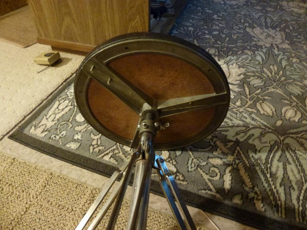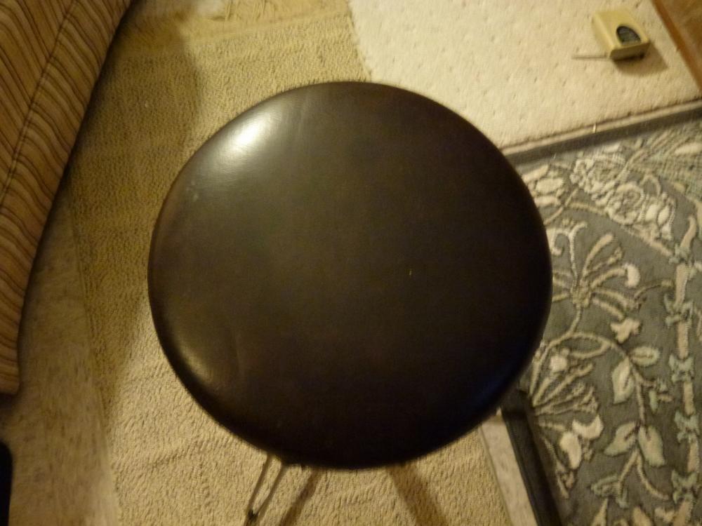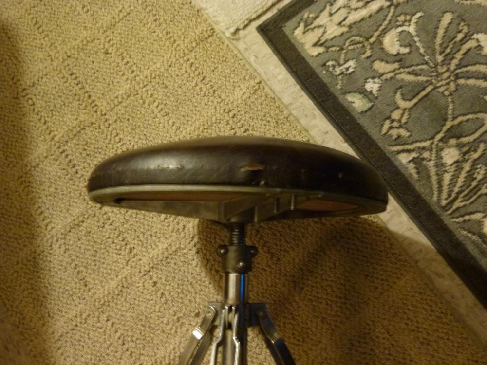 The throne is in good condition. The chrome will clean up nicely. The leather seat is in good condition with only a few small tears. I believe it needs new foam as it quickly deflates and you end up sitting on the wood base. It should be easy to replace. No rubber feet. $30 plus shipping.