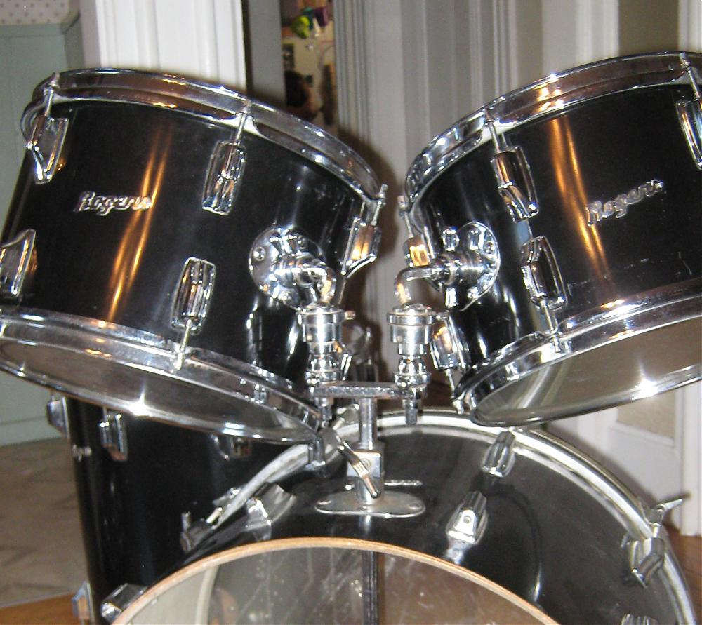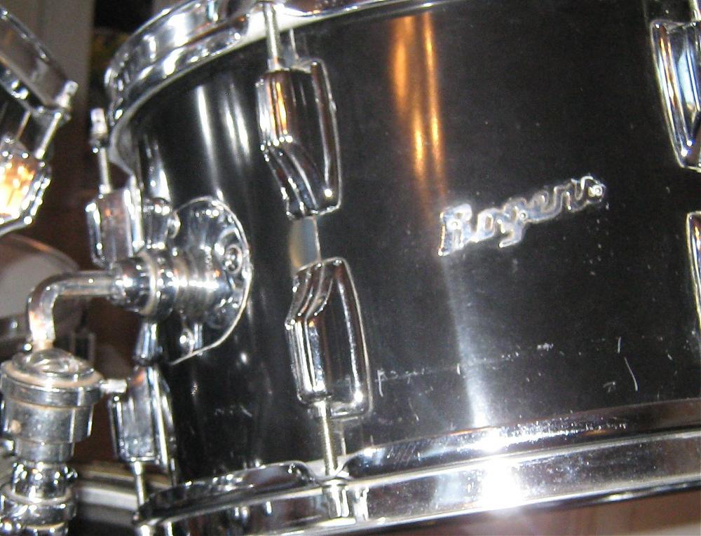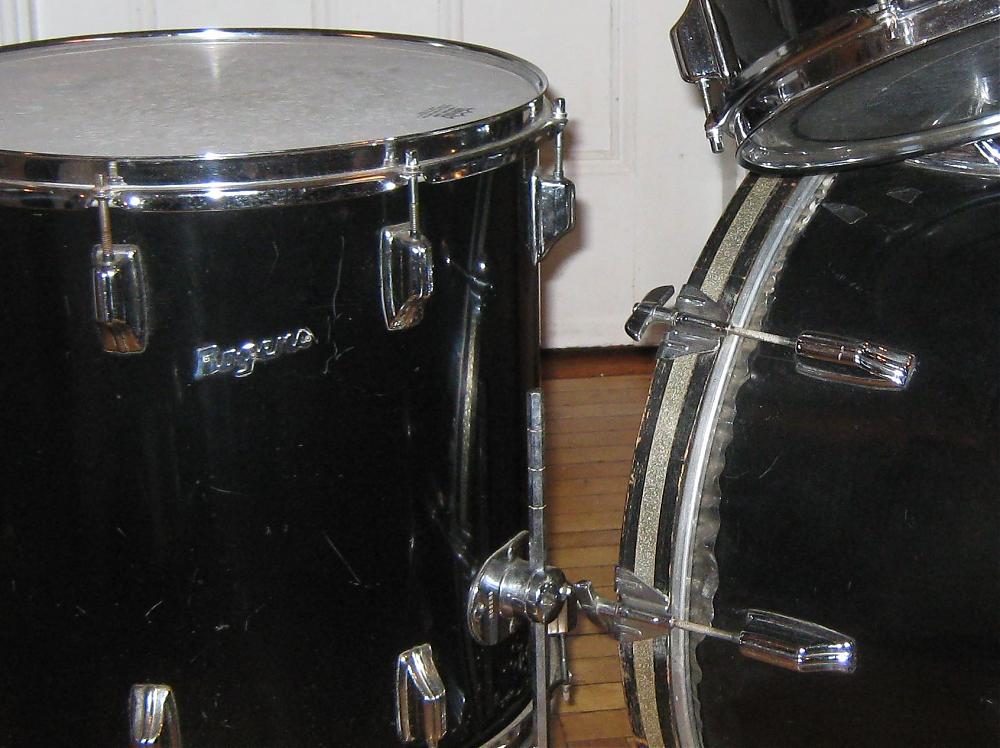 The shells have re-rings and seem thin with an internal gray coat. 12" 13" 16" 22". Some thin cracks internally on bass. Other than that in great shape!