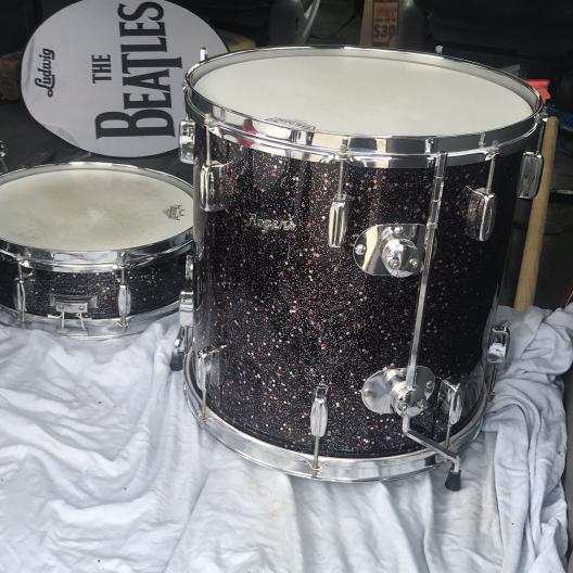 There has been for the past few months, an ad for an early 60s Rogers Holiday Cleveland era in Mardis Gras finish. I have seen a few of these kits here and there usually 3 or 4 with snare, this is 20 12 13 14 (matching snare) 16, possibly Showcase model? At first it was priced out of my league, but this gave me time to research as much as I could. Fast forward to last week I finally had enough saved $1800 to where I called him up and asked questions.