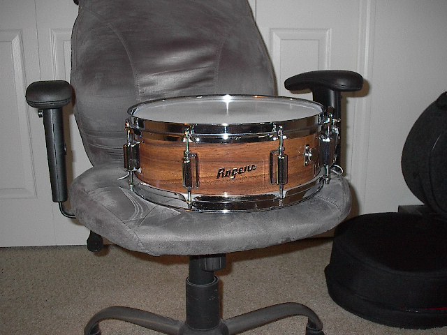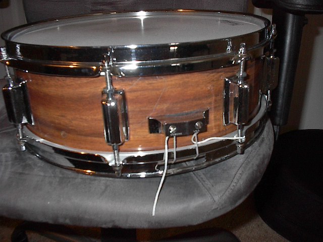 Also there is a matching maple 5x14 Powertone snare. The snare is not original: it is a genuine Rogers snare shell, but it is wrapped with genuine Koa wrap salvaged from a damaged tom. It has a few patched holes in the wrap, but it looks very good and sounds great.