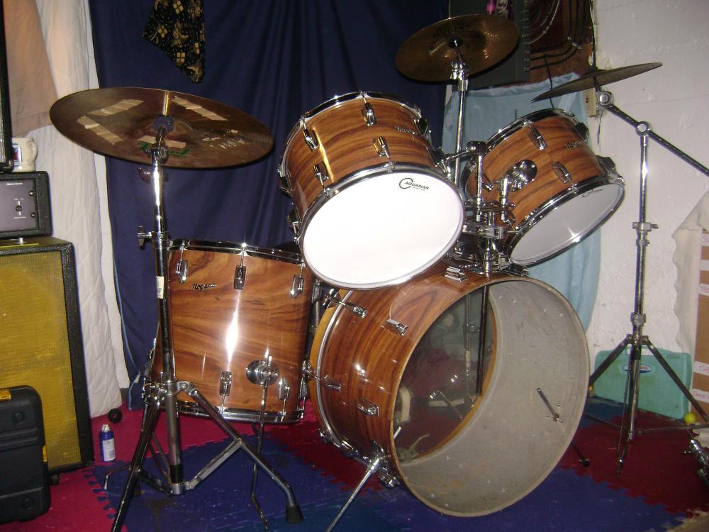 I've got a crazy old Rogers kit (In a particularly bizarre set-up in the old photo) I've had for about 10 years I thought I'd share with you drum nuts, maybe you can help educate me. I'm in Atlantic Canada, where I bought the kit from a kid back when I was in a lousy band in high-school. I didn't (still don't) know too much about drums but it was an old Rogers and I knew that was probably a good thing. It's not complete, and it's certainly not perfect, but I've got a soft spot for the old girl. I'd like to learn what I would need to get it back as close as I can to original prim and proper.