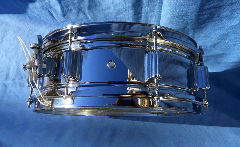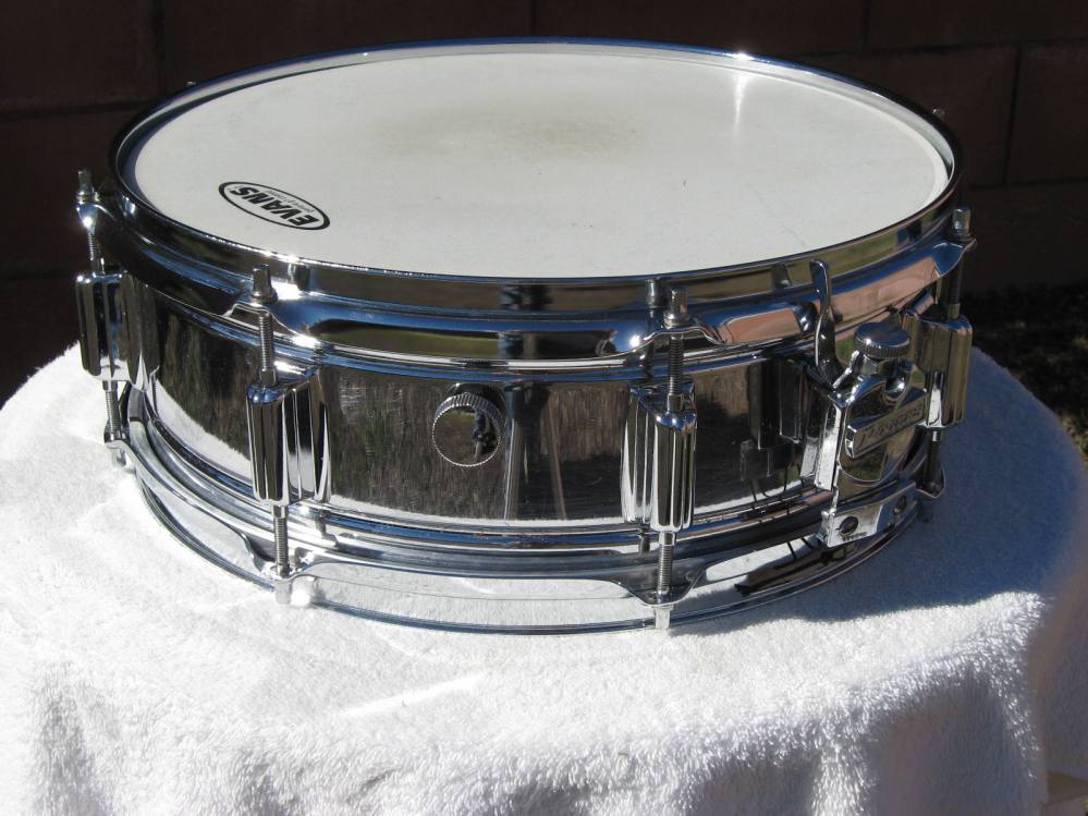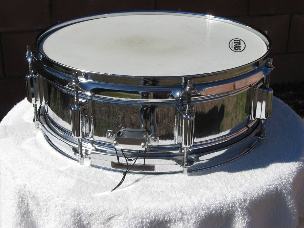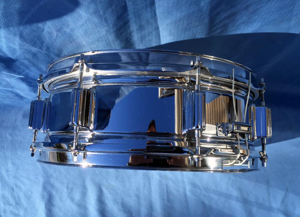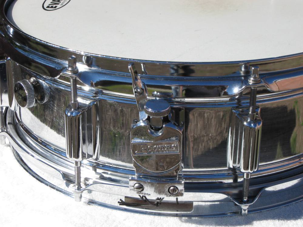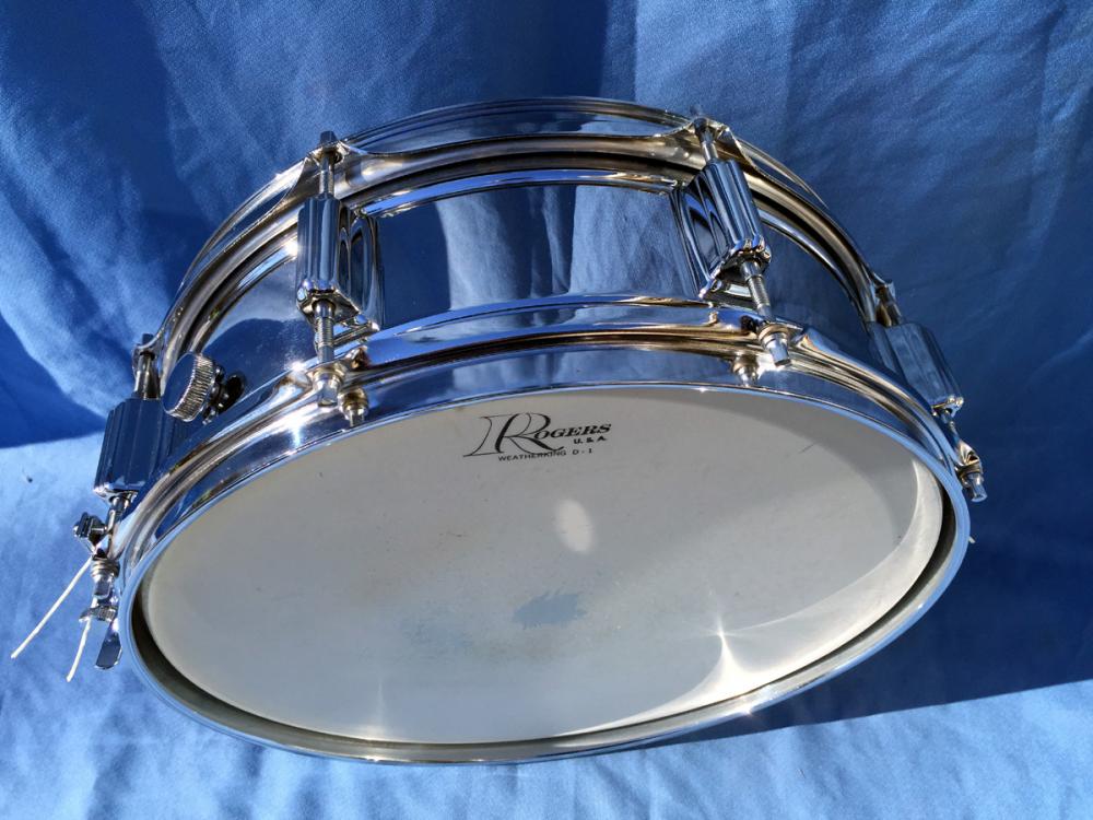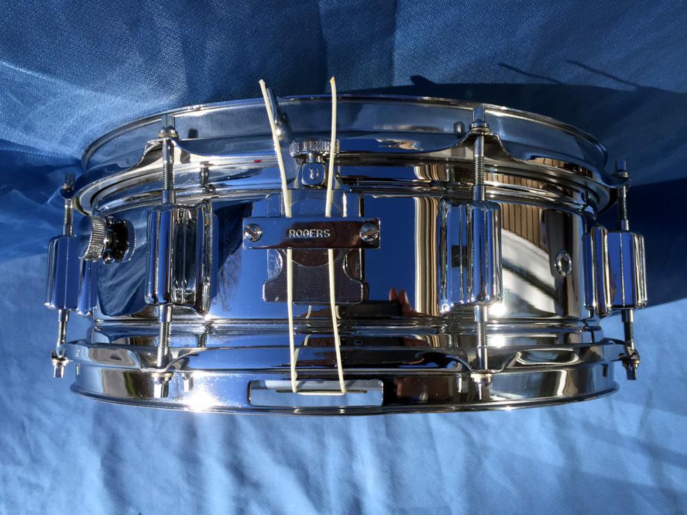 Another of my many snare drums for sale! This is a really nice Rogers R-360 snare drum from about 1968-69. These were built by Yamaha. The shell was obtained with only the original muffler. From my parts stash, I installed early Fullerton lugs, tension rods and a Swivomatic strainer, along with a MIJ butt that fit the existing holes…and looks very close to the original! Generic hoops, a new set of Puresound wires and good used Evans heads. The drum looks like a Powertone, but with a steel shell. A really nice snare drum!