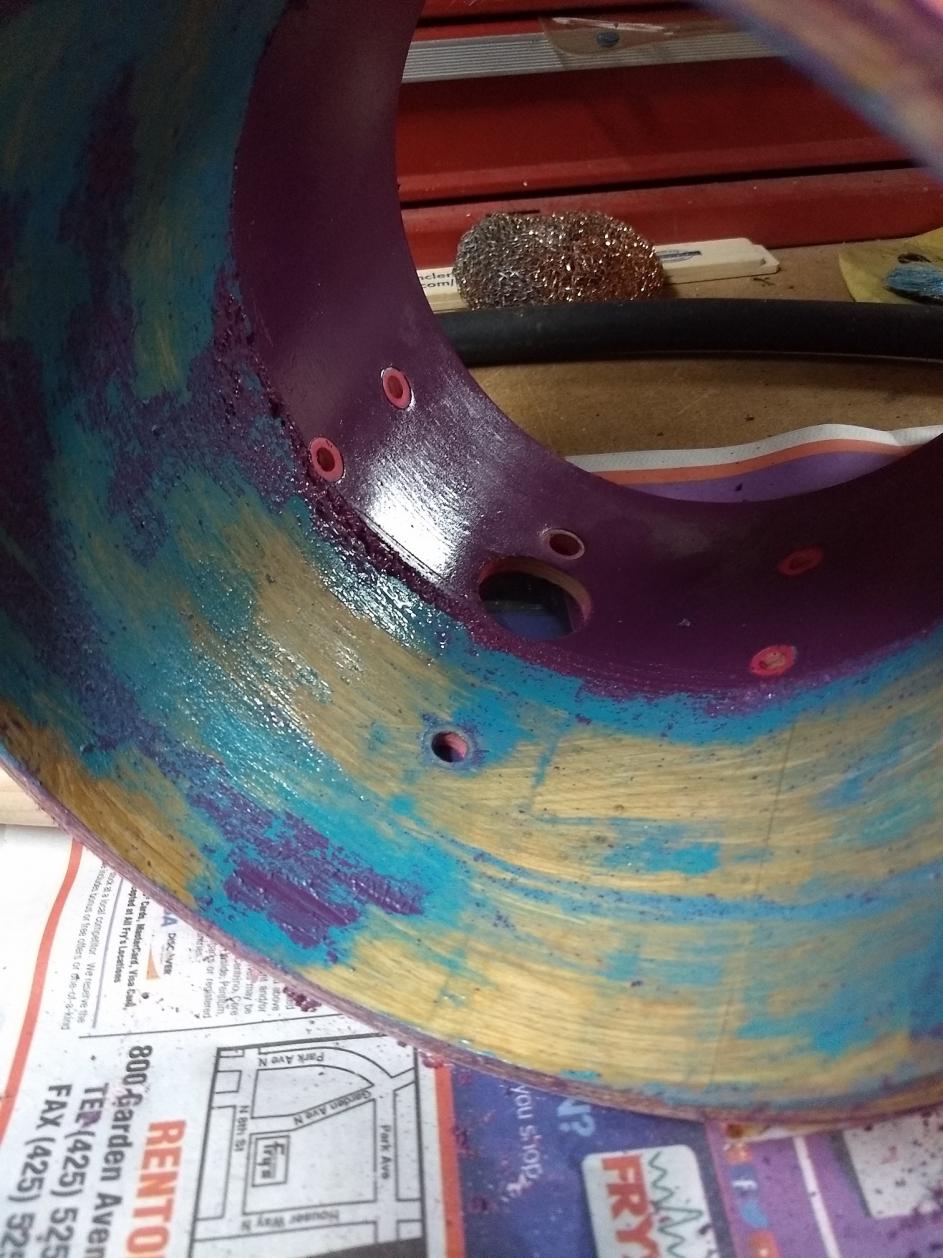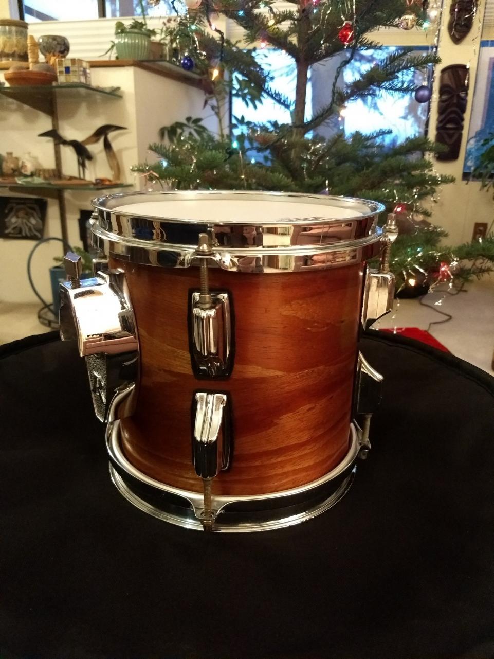 Cracked wrap. Painted exterior. Double Painted interior! Wrap removed, paint removed. Then - OMG - extra holes drilled for bottom lugs. New Koa Wood veneer applied. Bearing edges cut (bottom one fully, top one touched up). Still gonna put on a pair of matching script badges to match the rest of the set - just because I like them more than the foil badges. New top rim from David Drewniak.