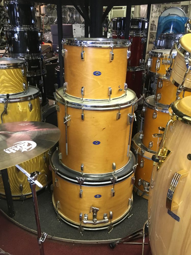 I stopped in at Professional Drum Shop this last Saturday. Always a cool place to hang out! This mid-60's Slinger-Leedy kit caught my eye and I wanted to share a picture of it with everyone. You just don't see them in these sizes very often! 14x24, 18x20 and a 12x15 rack tom, complete with diamond plate to attach to the rail consolette. All drums in natural maple! Enjoy!